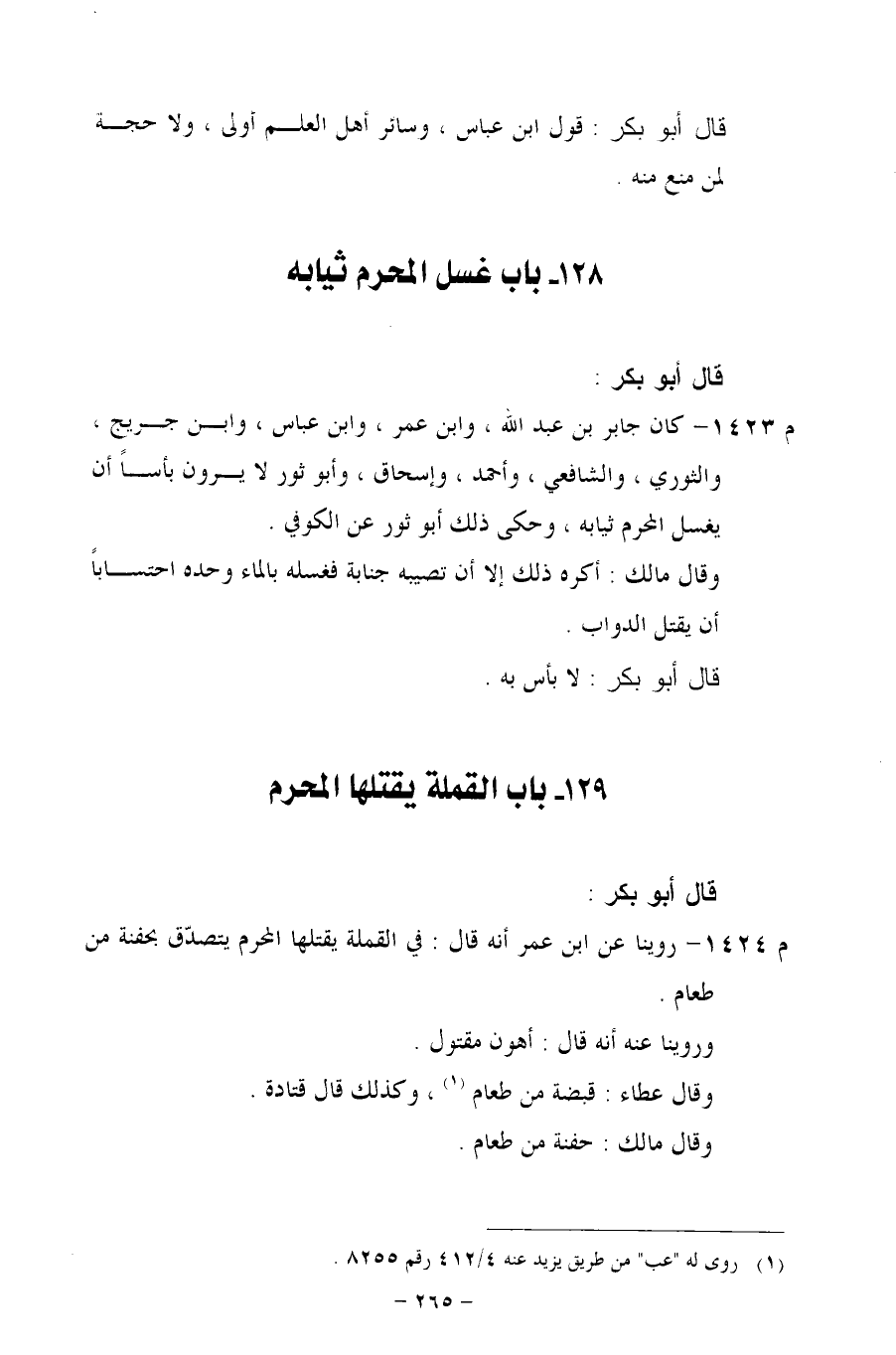 م 1423 - كان جابر بن عبد الله، وابن عمر، وابن عباس، وابن جريج، والثوري، والشافعي، وأحمد، وإسحاق، وأبو ثور لا يرون بأساً أن يغسل المحرم ثيابه، وحكى ذلك أبو ثور عن الكوفي.