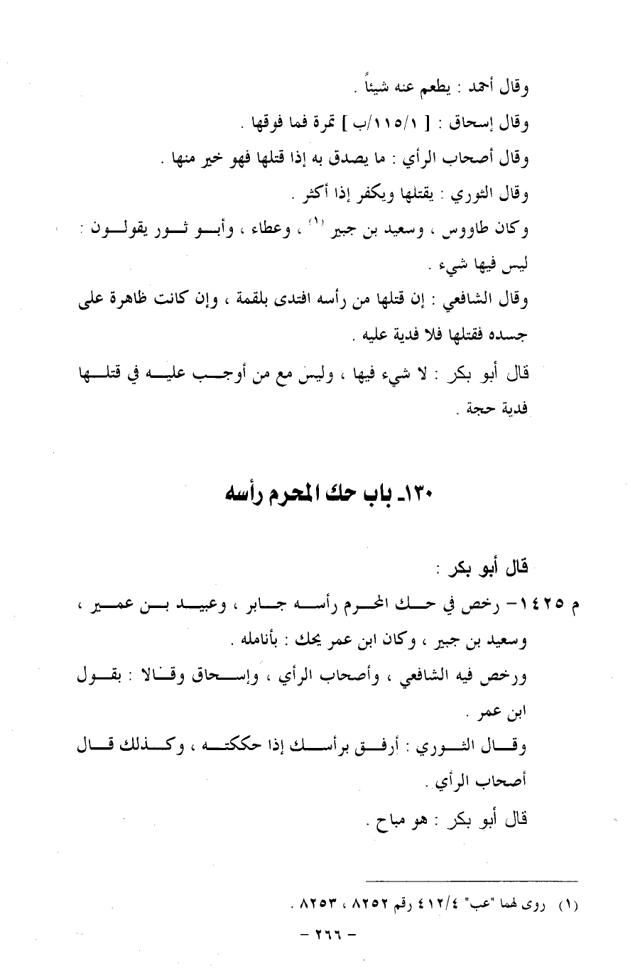 م 1425 - رخص في حك المحرم رأسه جابر، وعبيد بن عمير، وسعيد بن جبير، وكان ابن عمر يحك: بأنامله.
