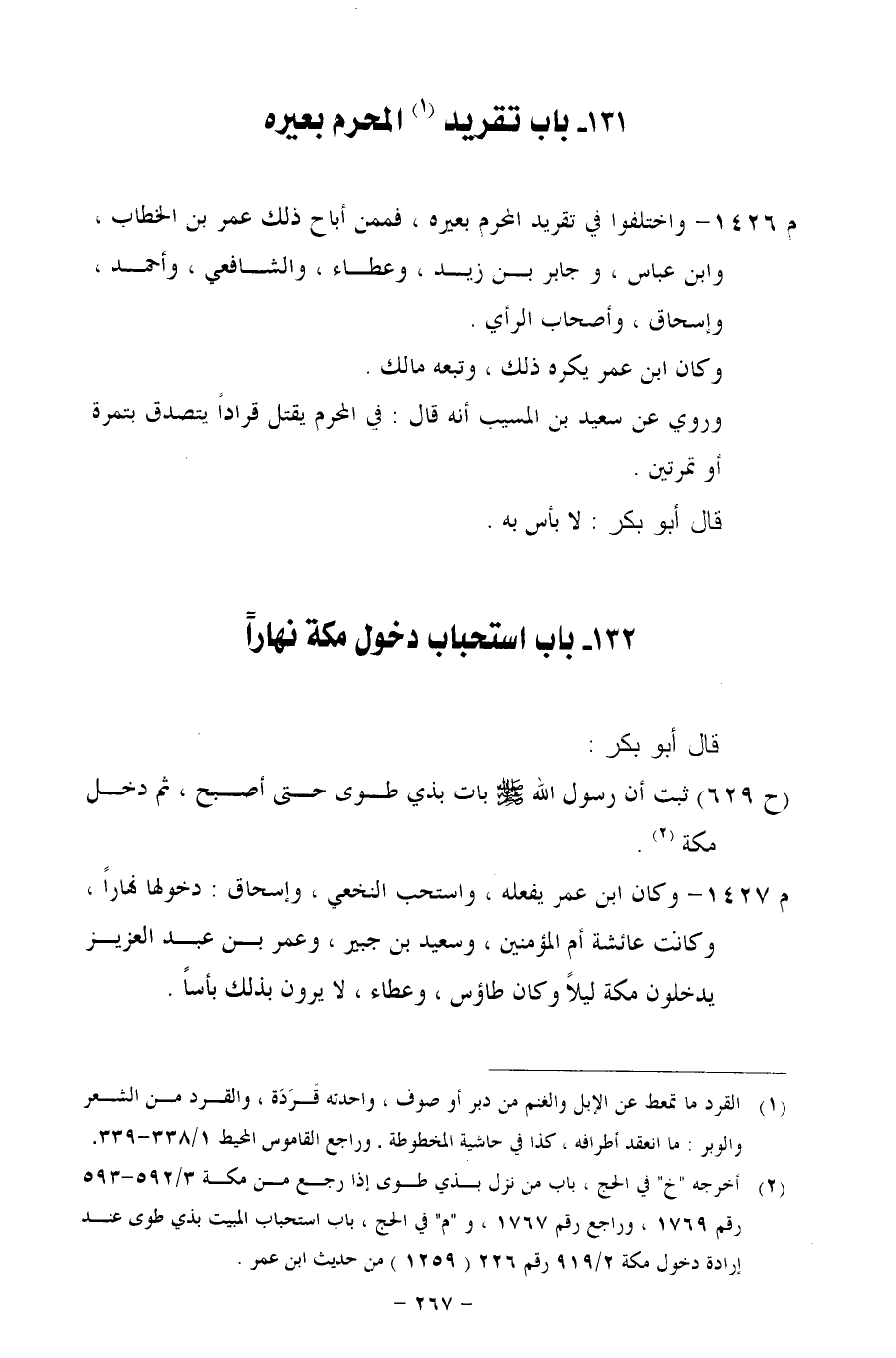 م 1426 - واختلفوا في تقريد المحرم بعيره، فممن أباح ذلك عمر بن الخطاب، وابن عباس، وجابر بن زيد، وعطاء، والشافعي، وأحمد، وإسحاق، وأصحاب الرأي.