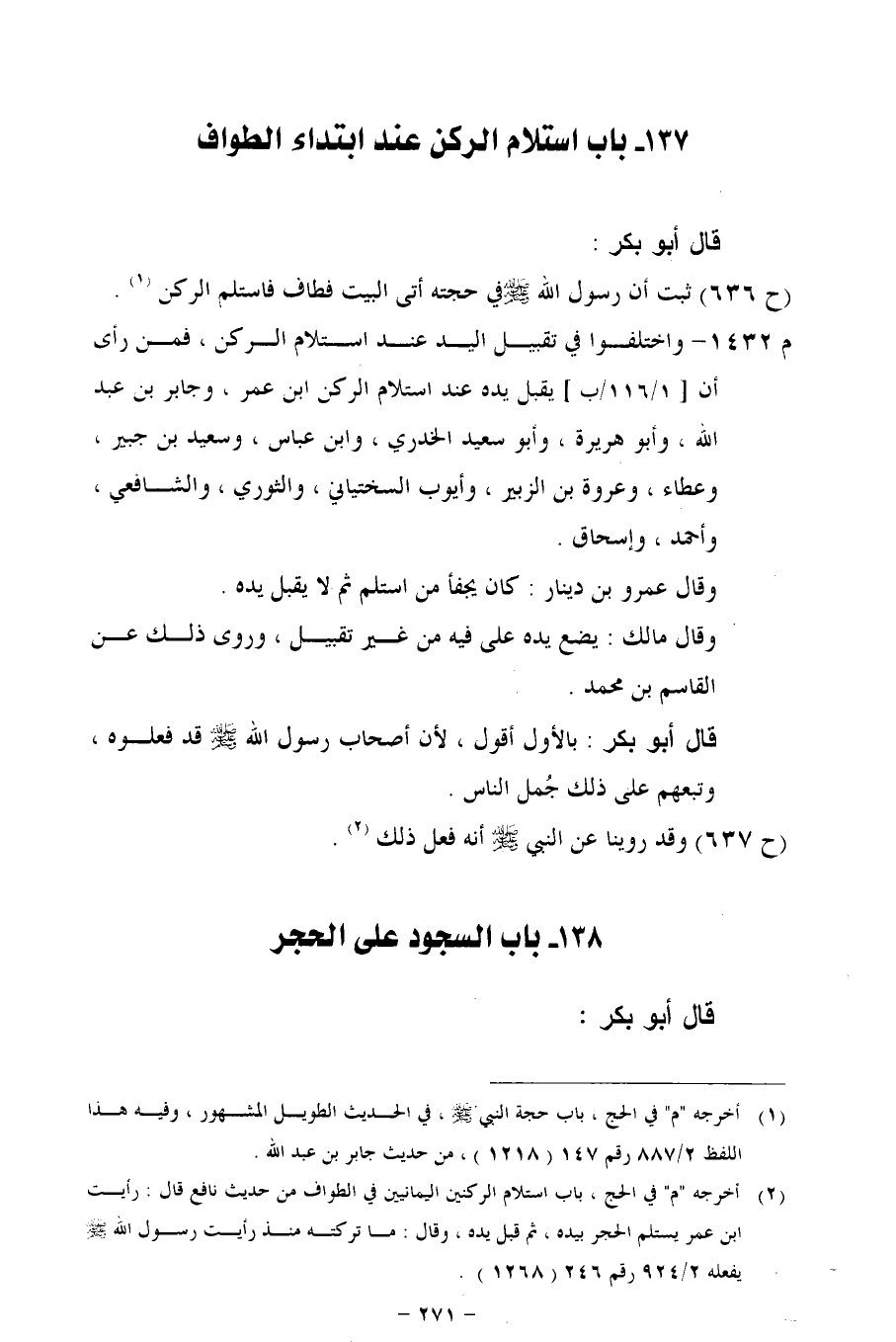 م 1432 - واختلفوا في تقبيل اليد عند استلام الركن، فمن رأى أن [1/ 116/ب] يقبل يده عند استلام الركن ابن عمر، وجابر بي عبد الله، وأبو هريرة، وأبو سعيد الخدرى، وابن عباس، وسعيد بن جبير، وعطاء، وعروة بن الزبير، وأيوب السختياني، والثوري، والشافعي، وأحمد، وإسحاق.