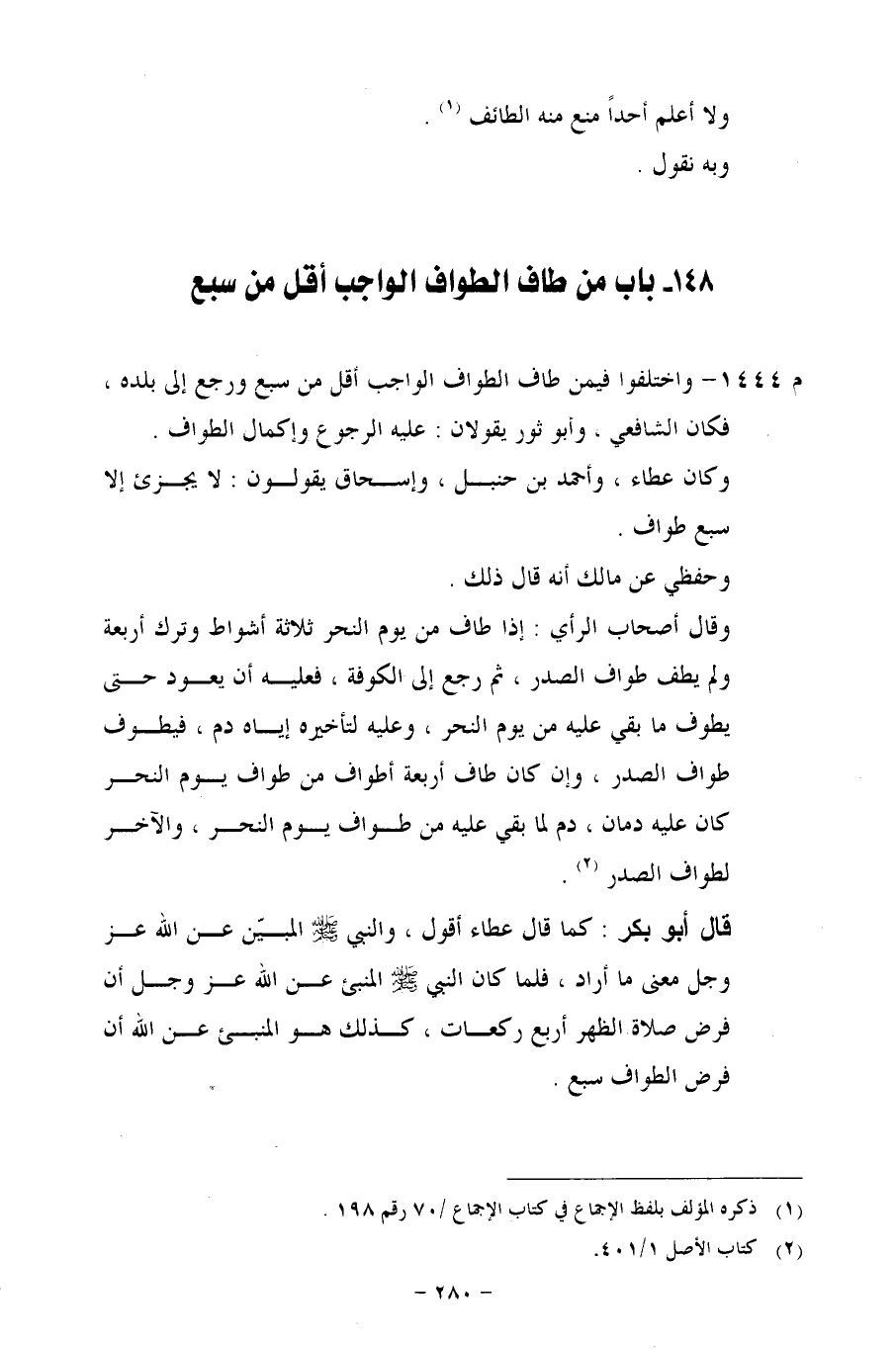 م 1444 - واختلفوا فيمن طاف الواجب أقل من سبع ورجع إلى بلده، فكان الشافعي. وأبو ثور يقولان: عليه الرجوع وإكمال الطواف.