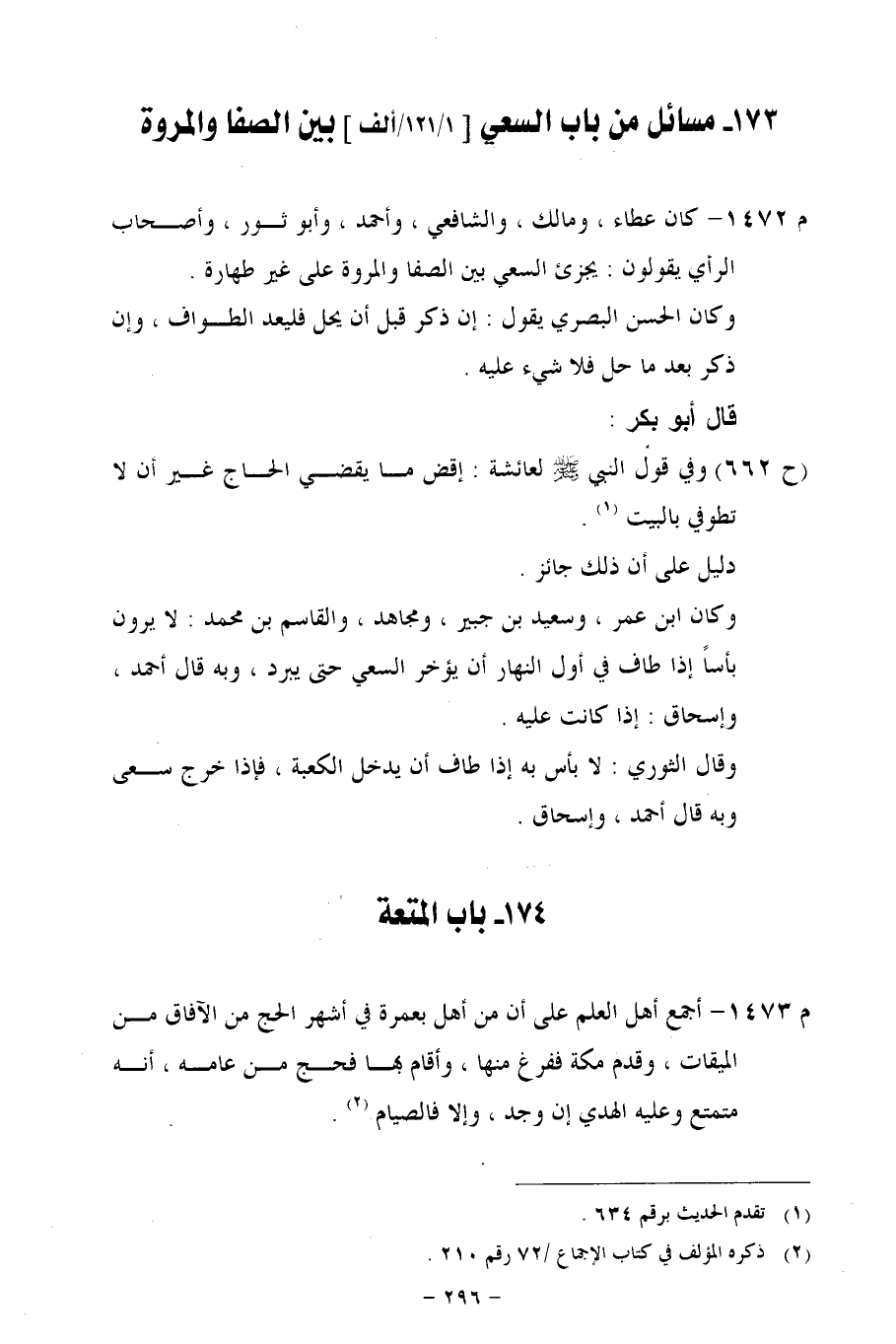 م 1472 - كان عطاء، ومالك، والشافعي، وأحمد، وأبو ثور، وأصحاب الرأي يقولون: يجزئ السعي بين الصفا والمروة على غير طهارة.