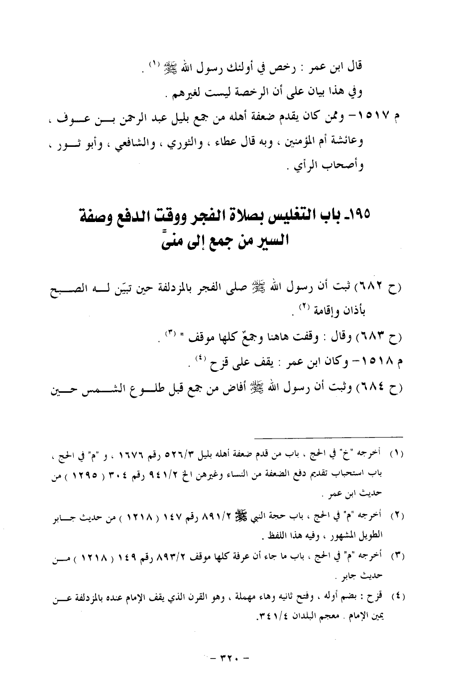 195 - باب التغليس بصلاة الفجر ووقت الدفع وصفة السير من جمع إلى منيً