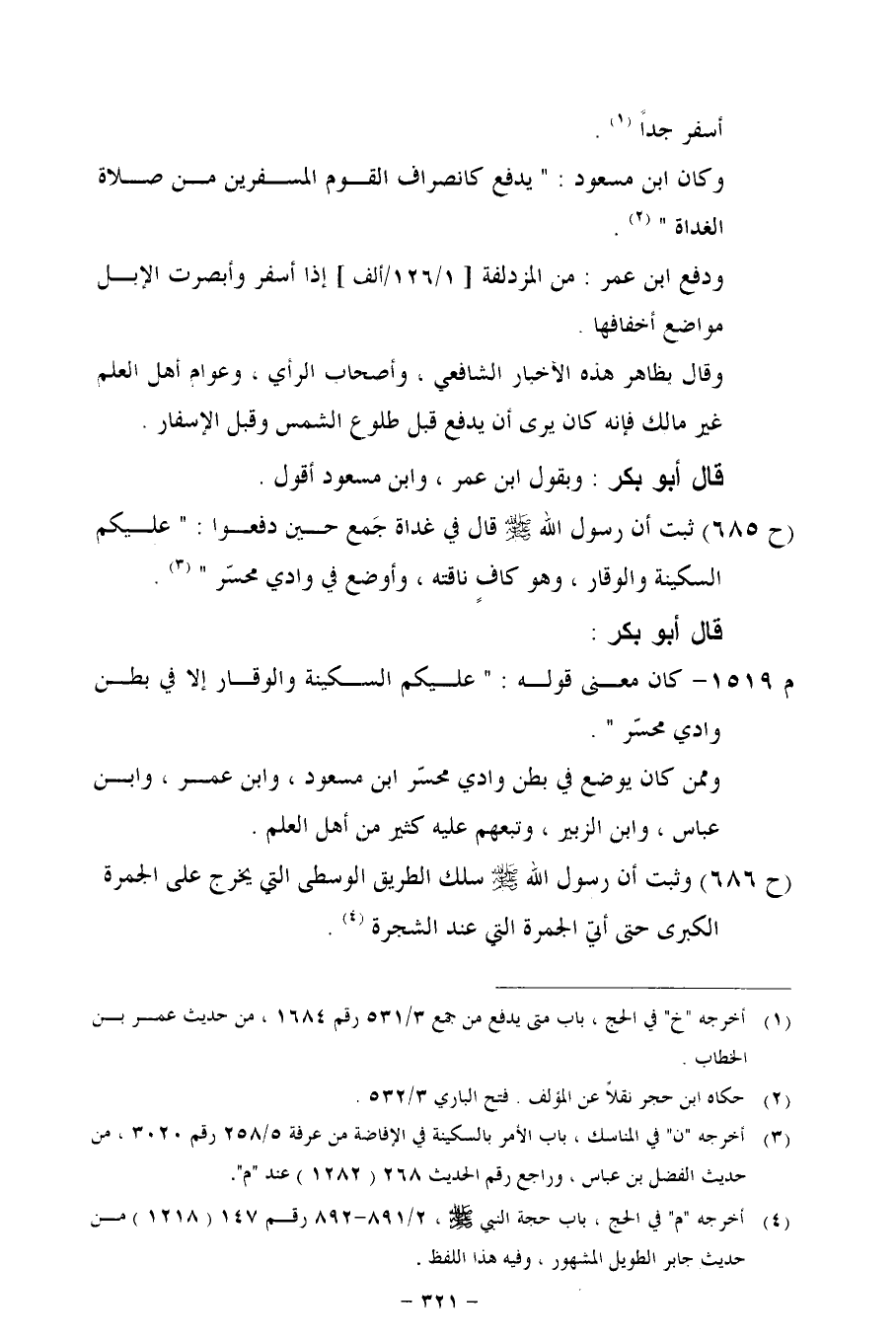 (ح 685) ثبت أن رسول الله- صلى الله عليه وسلم - قال في غداة جَمع حين دفعوا: "عليكم السكينة والوقار، وهو كافٍ ناقته، وأوضع في وادي محسّر".
