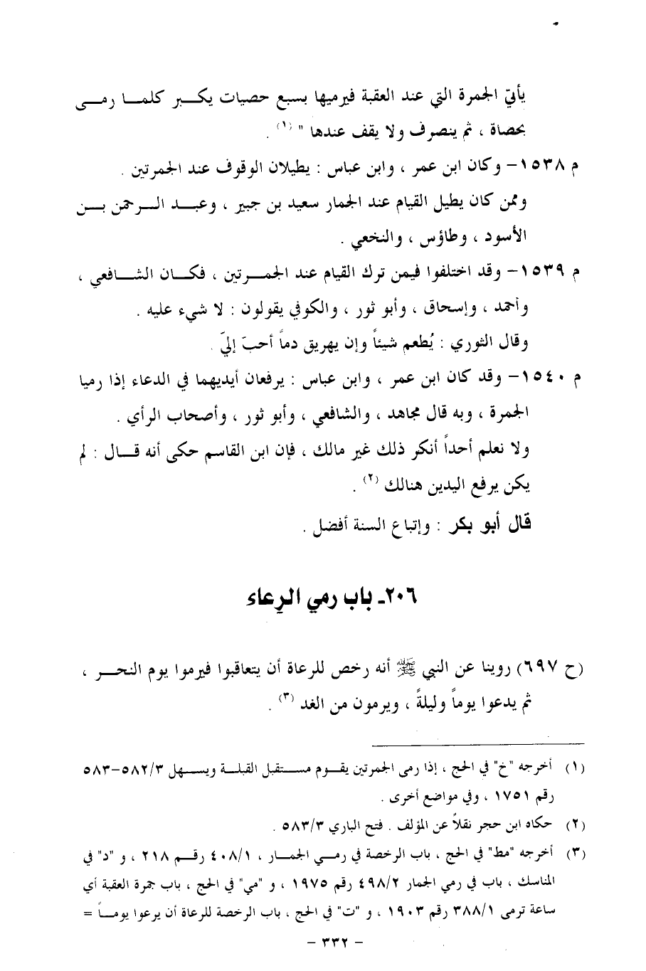 م 1539 - وقد اختلفوا فيمن ترك القيام عند الجمرتين، فكان الشافعي، وأحمد، وإسحاق، وأبو ثور، والكوفي يقولون: لا شيء عليه.