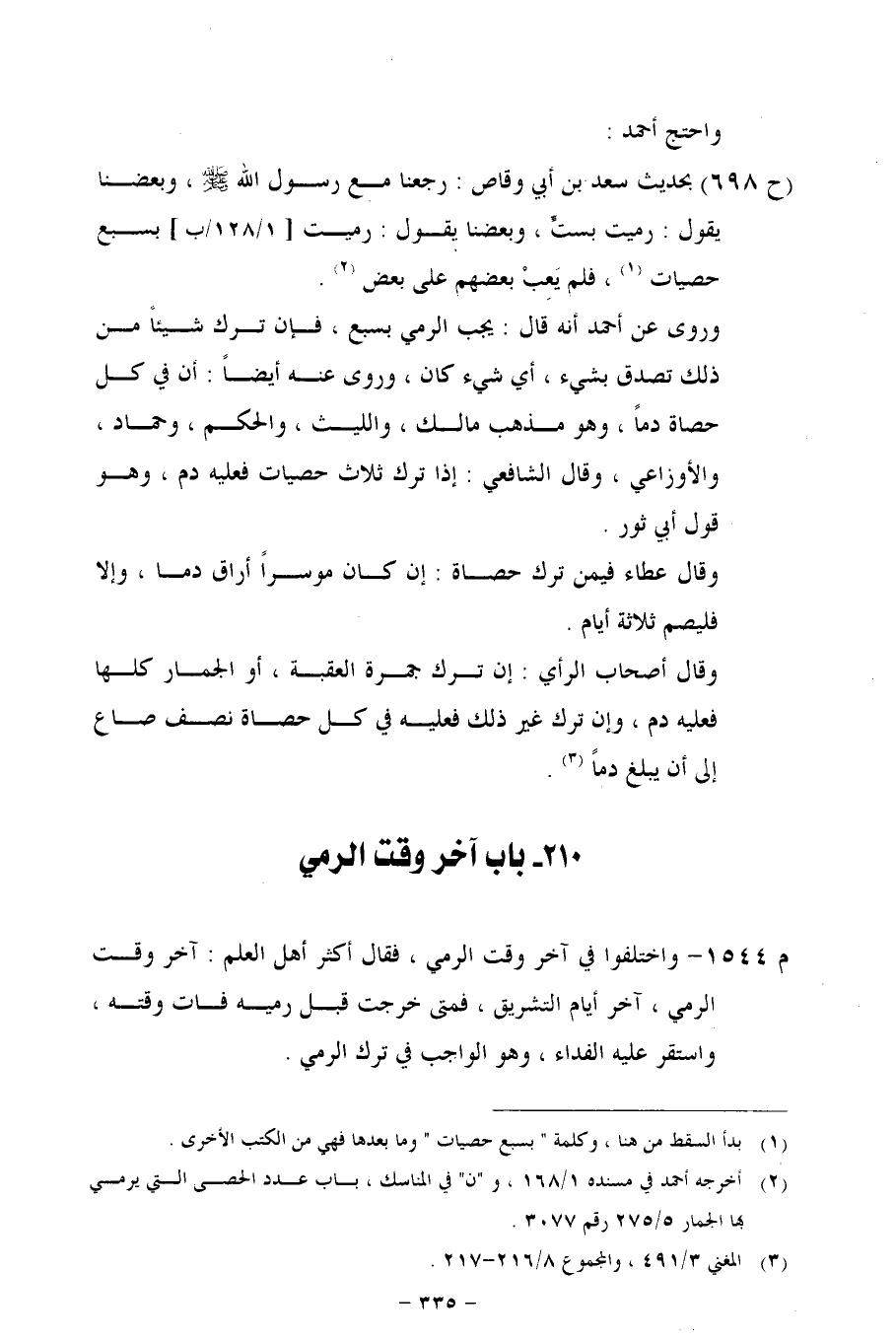 قال مُعِدُّ الكتاب للشاملة: وثبت عند النسائي في سننه من حديث سعد بن أبي وقاص قال: «رَجَعْنَا فِي الْحَجَّةِ مَعَ النَّبِيِّ صَلَّى اللهُ عَلَيْهِ وَسَلَّمَ وَبَعْضُنَا يَقُولُ: رَمَيْتُ بِسَبْعِ حَصَيَاتٍ، وَبَعْضُنَا يَقُولُ: رَمَيْتُ بِسِتٍّ، فَلَمْ يَعِبْ بَعْضُهُمْ عَلَى بَعْضٍ» قال الألباني: صحيح الإسناد