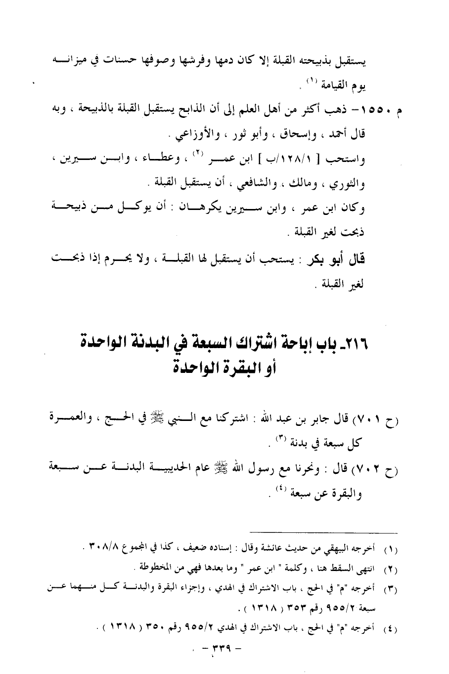 (ح 701) قال: جابر بن عبد الله: اشتركنا مع النبي- صلى الله عليه وسلم - في الحج، والعمرة كل سبعة في بدنة.