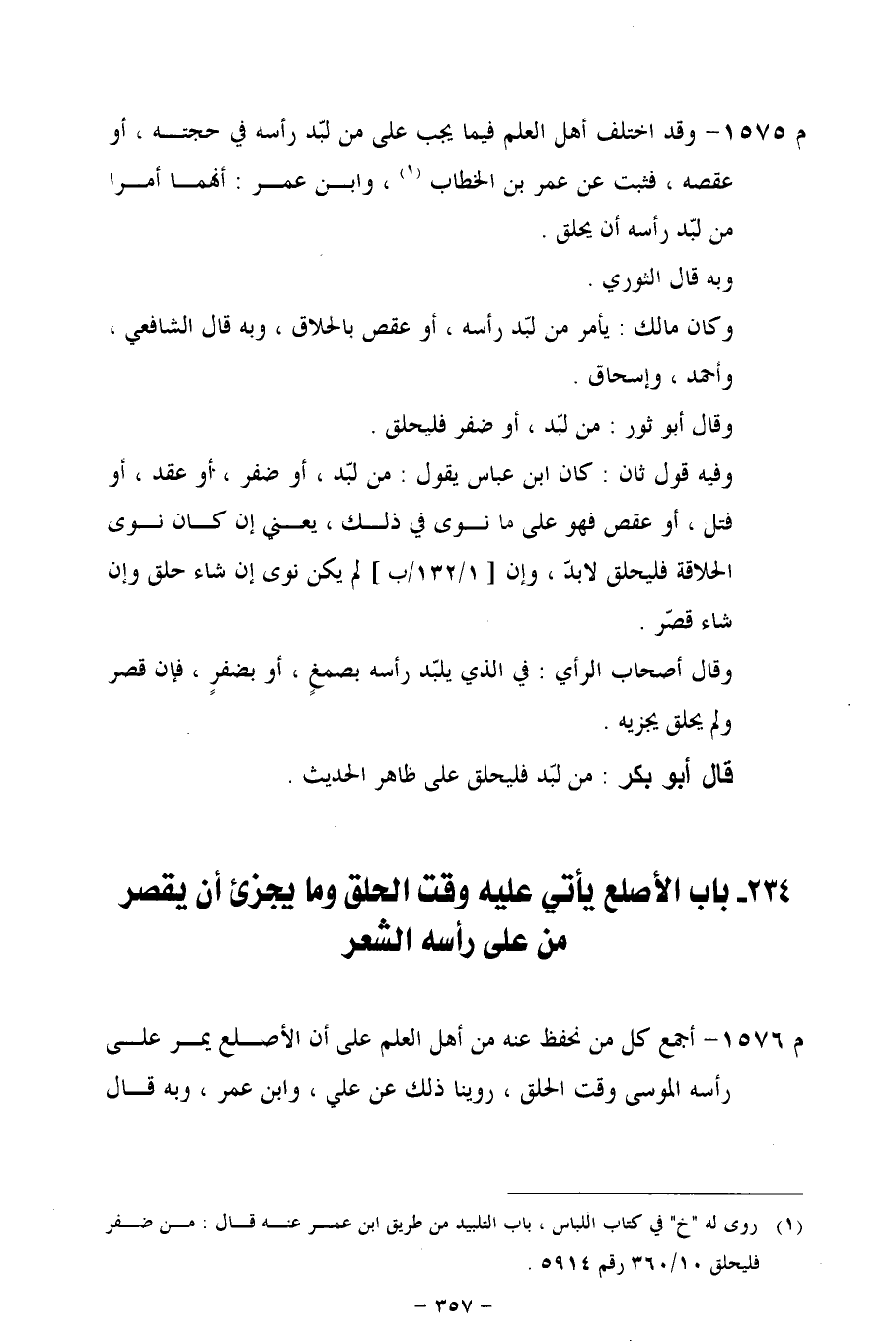 م 1576 - أجمع كل من نحفظ عنه من أهل العلم على أن الأصلع يمر على رأسه الموسى وقت الحلق، روينا ذلك عن علي، وابن عمر، وبه قال