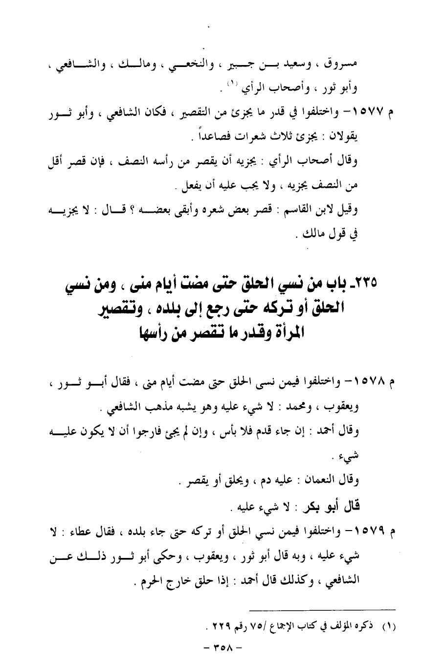 م 1577 - واختلفوا في قدر ما يجزئ من التقصير، فكان الشافعي، وأبو ثور يقولان: يجزئ ثلاث شعرات فصاعداً.