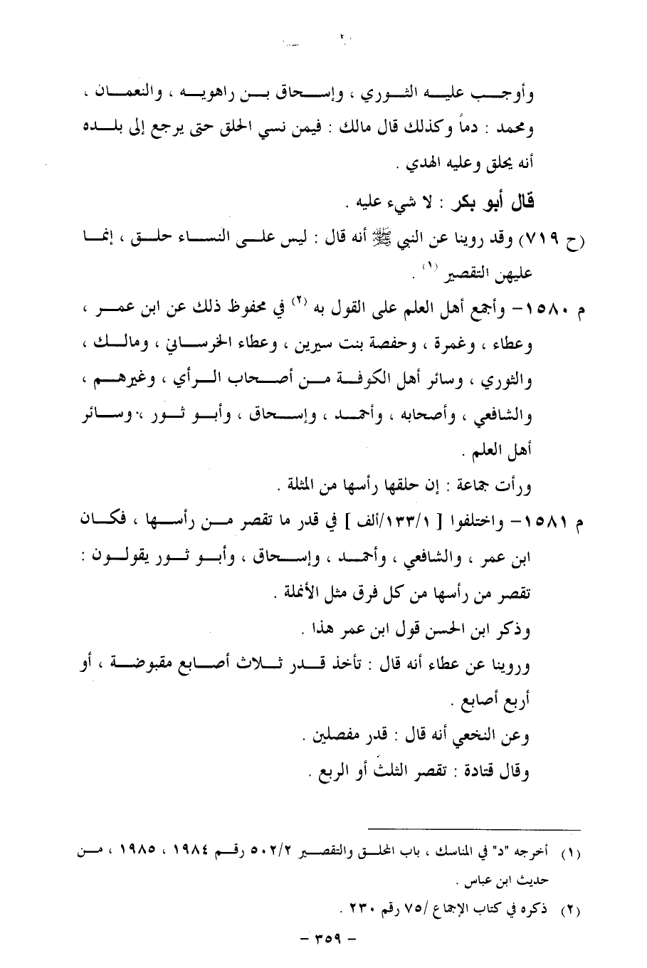 م 1581 - واختلفوا [1/ 133/ألف] في قدر ما تقصر من رأسها، فكان ابن عمر، والشافعي، وأحمد، وإسحاق، وأبو ثور يقولون: تقصر من رأسها من كل فرق مثل الأنملة.