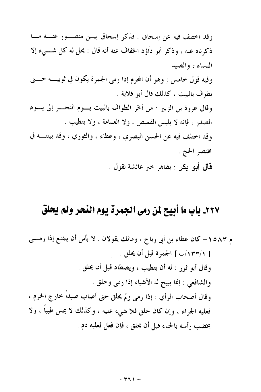 م 1583 - كان عطاء بن أبي رباح، ومالك يقولان: لا بأس أن يتقنع إذا رمى [1/ 133/ب] الجمرة قبل أن يحلق.