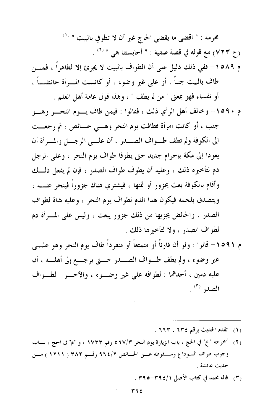 م 1589 - ففي ذلك دليل على أن الطواف بالبيت لا يجزئ إلا لطاهراً، فمن طاف بالبيت جنباً، أو على غير وضوء، أو كانت المرأة حائضاً، أو نفساء فهو بمعنى "من لم يطف"، وهذا قول عامة أهل العلم.