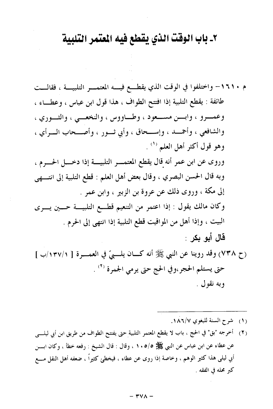 م 1610 - واختلفوا في الوقت الذي يقطع فيه المعتمر التلبية، فقالت طائفة: يقطع التلبية إذا افتتح الطواف، هذا قول ابن عباس، وعطاء، وعمرو، وابن مسعود، وطاووس، والنخعي، والثوري، والشافعي، وأحمد، وإسحاق، وأبي ثور، وأصحاب الرأي، وهو قول أكثر أهل العلم.