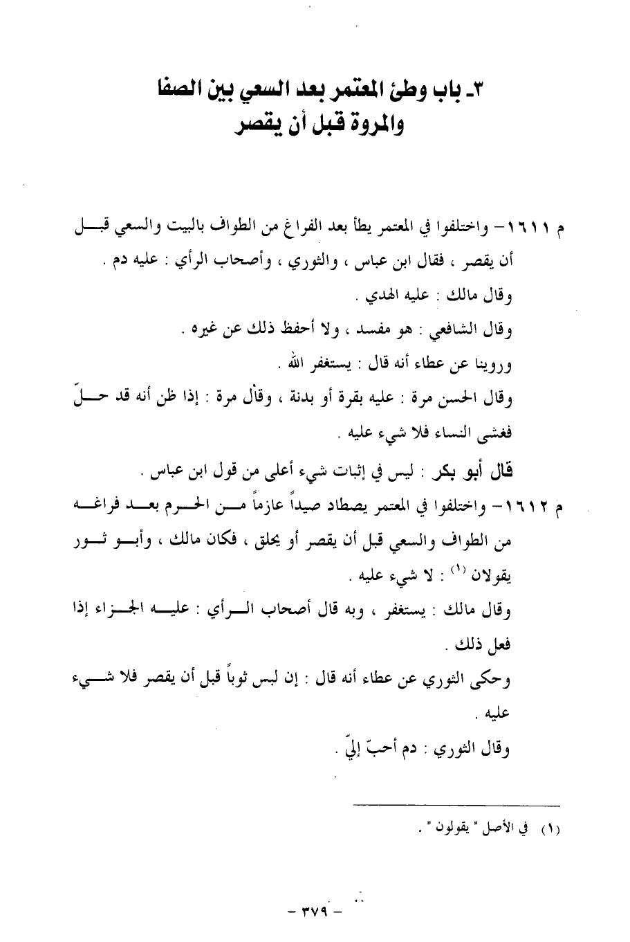 م 1611 - واختلفوا في المعتمر يطأ بعد الفراغ من الطواف بالبيت والسعي قبل أن يقصر، فقال ابن عباس، والثوري، وأصحاب الرأي: عليه دم.