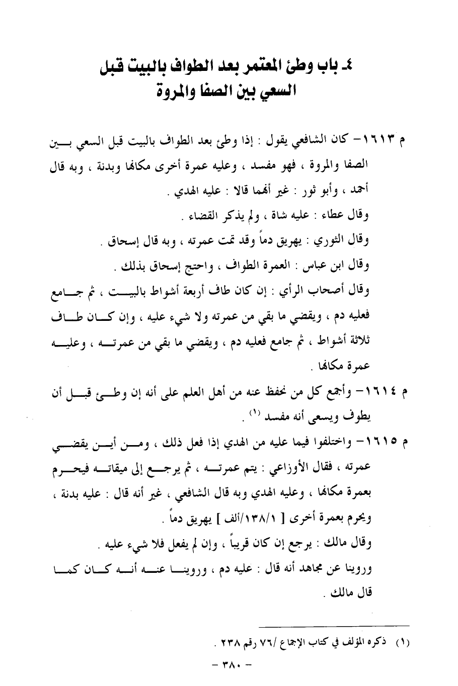 م 1613 - كان الشافعي يقول: إذا وطئ بعد الطواف بالبيت قبل السعي بين الصفا والمروة، فهو مفسد، وعليه عمرة أخرى مكانها وبدنة، وبه قال أحمد، وأبو ثور: غير أنهما قالا: عليه الهدي.