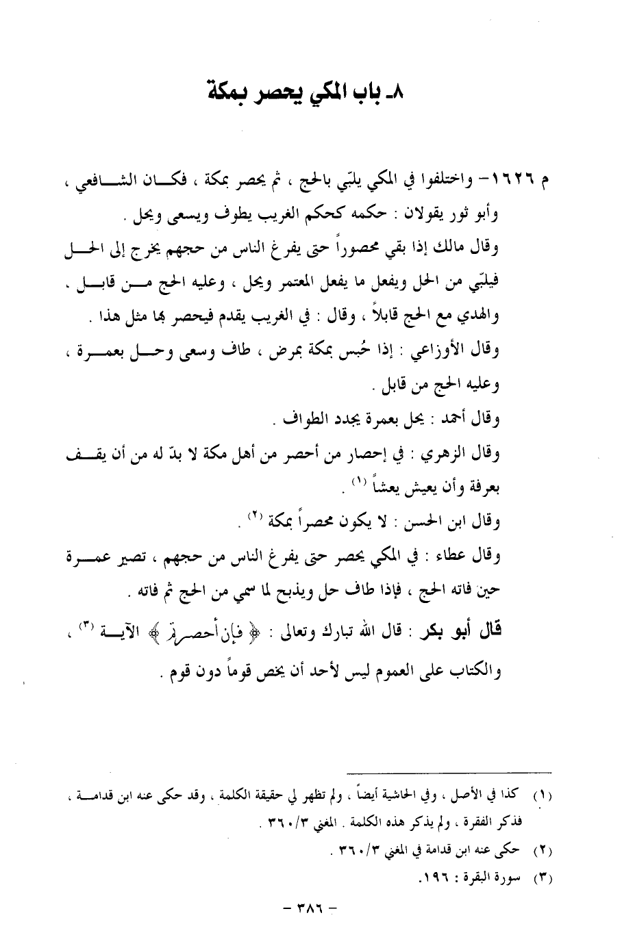 م 1626 - واختلفوا في المكي يلبّي بالحج، ثم يحصر بمكة، فكان الشافعي، وأبو ثور يقولان: حكمه كحكم الغريب يطوف ويسعى ويحل.