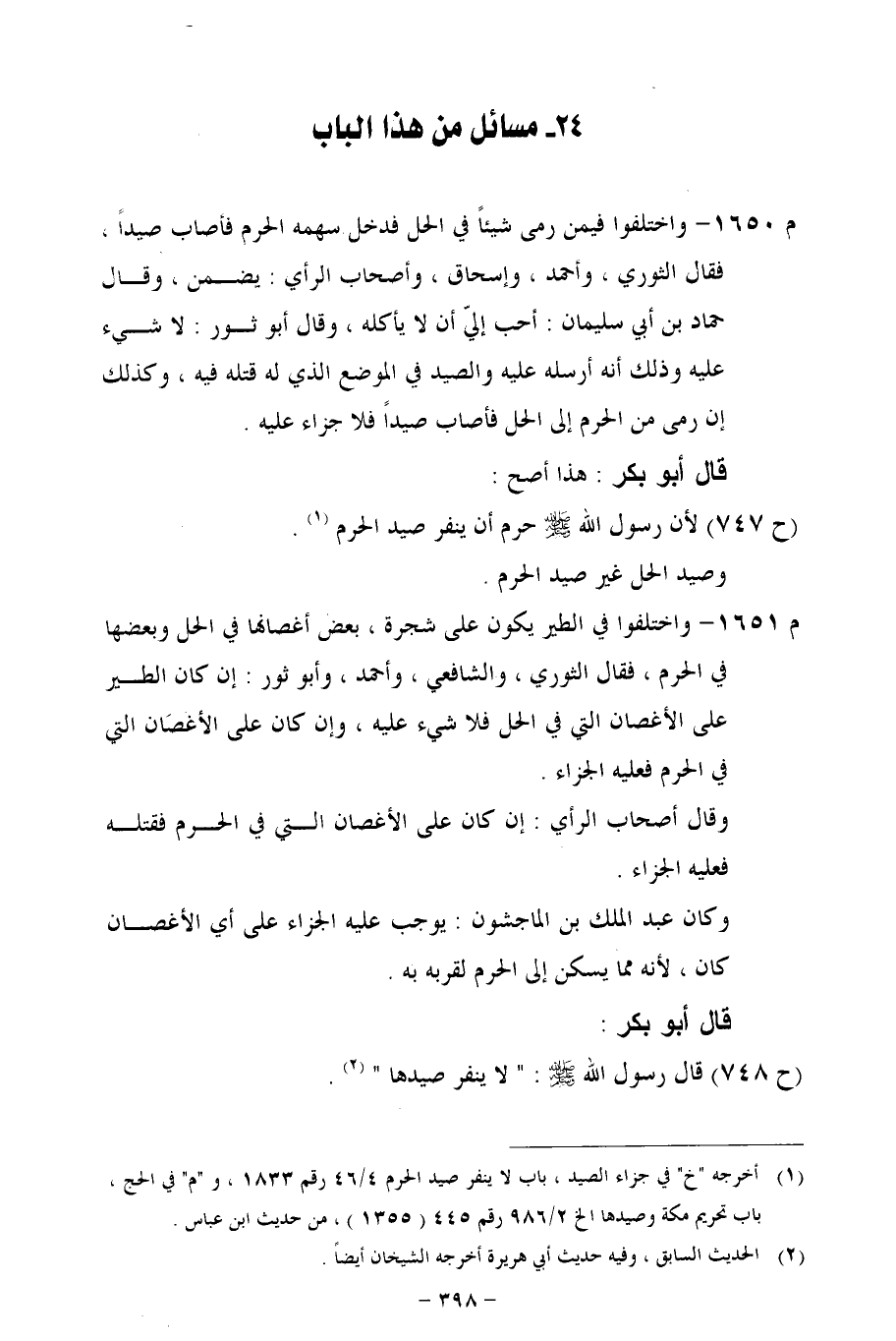 م 1651 - واختلفوا في الطير يكون على شجرة، بعض أغصانها في الحل وبعضها في الحرم، فقال الثوري، والشافعي، وأحمد، وأبو ثور: إن كان الطير على الأغصان التي في الحل فلا شيء عليه، وإن كان على الأغصَان التي في الحرم فعليه الجزاء.