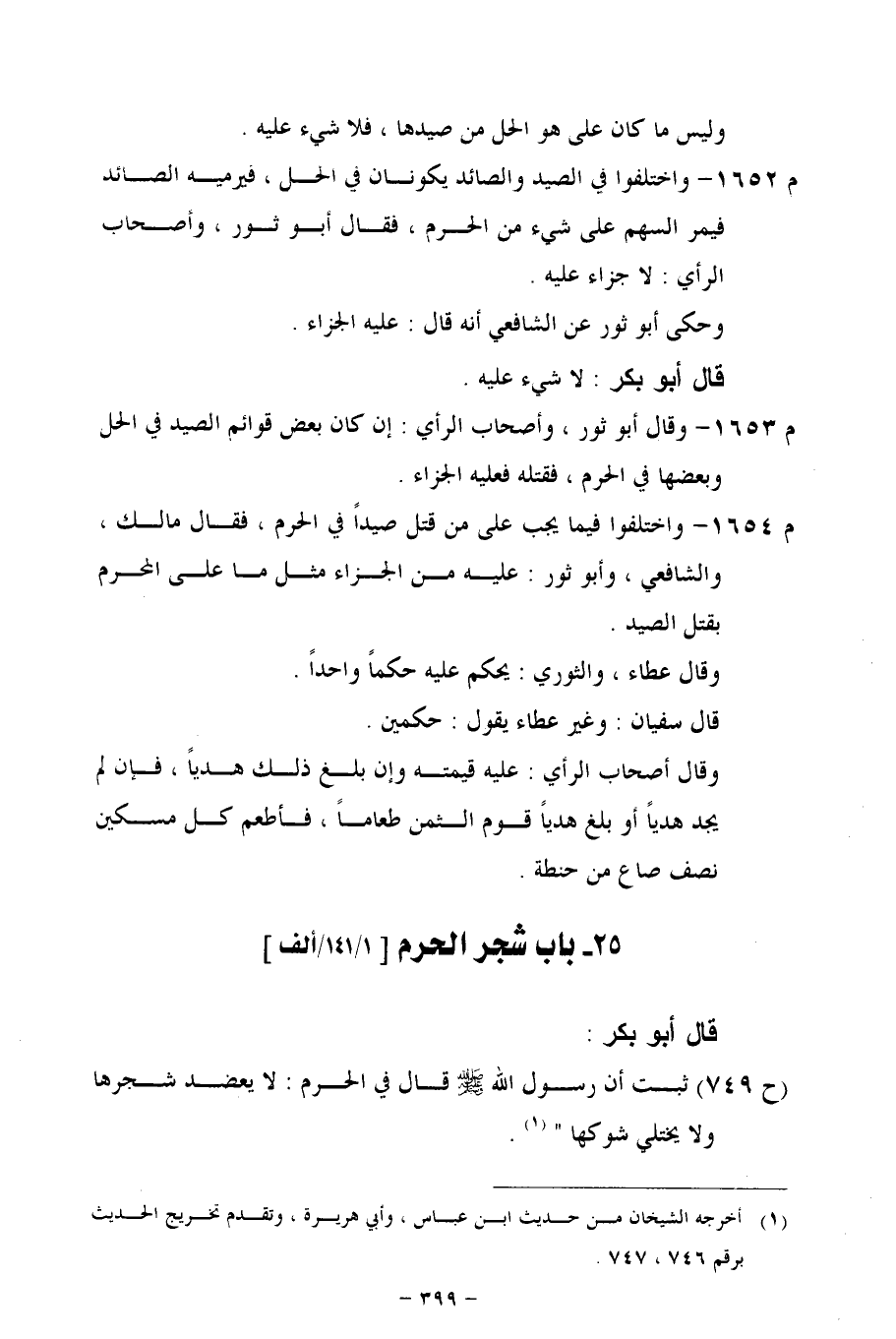 م 1652 - واختلفوا في الصيد والصائد يكونان في الحل، فيرميه الصائد فيمر السهم علي شيء من الحرم، فقال أبو ثور، وأصحاب الرأي: لا جزاء عليه.