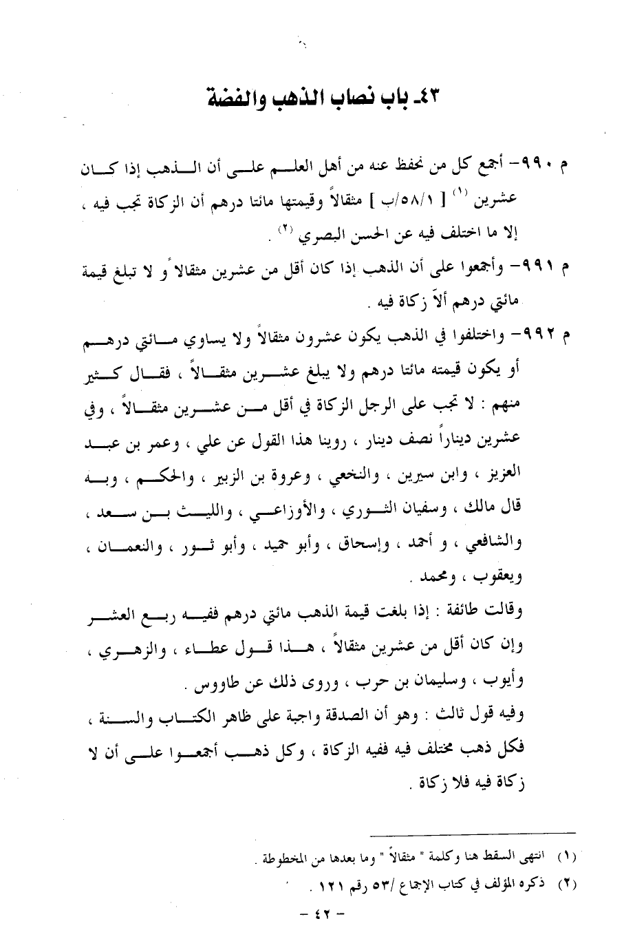 م 992 - واختلفوا في الذهب يكون عشرون مثقالاً ولا يساوي مائتي درهم أو يكون قيمته مائتا درهم ولا يبلغ عشرين مثقالاً، فقال كثير منهم: لا تجب على الرجل الزكاة في أقل من عشرين مثقالاً، وفي عشرين ديناراً نصف دينار، روينا هذا القول عن علي، وعمر بن عبد العزيز، وابن سيرين، والنخعي، وعروة بن الزبير، والحكم، وبه قال مالك، وسفيان الثوري، والأوزاعي، والليث بن سعد، والشافعي، وأحمد، وإسحاق، وأبو حميد، وأبو ثور، والنعمان، ويعقوب، ومحمد.