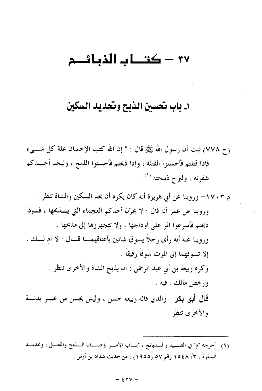 (ح 778) ثبت أن رسول الله- صلى الله عليه وسلم - قال: إن الله كتب الإحسان على كل شيء فإذا قتلتم فأحسنوا القتلة، وإذا ذبحتم فأحسنوا الذبح، وليحد أحدكم شفرته، وليرح ذبيحته.