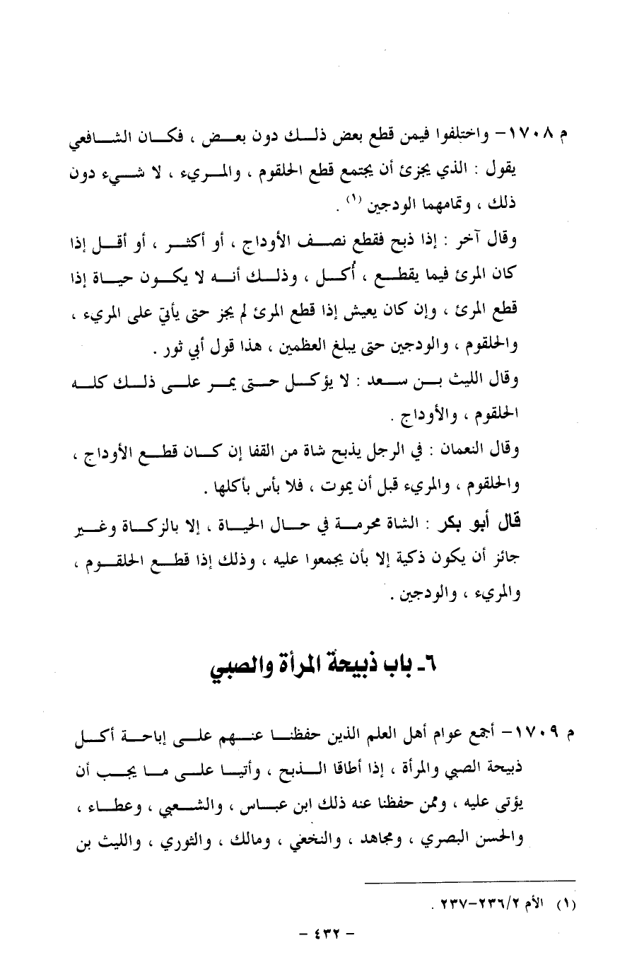 م 1708 - واختلفوا فيمن قطع بعض ذلك دون بعض، فكان الشافعي يقول: الذي يجزئ أن يجتمع قطع الحلقوم، والمريء، لا شيء دون ذلك، وتمامها الودجين.