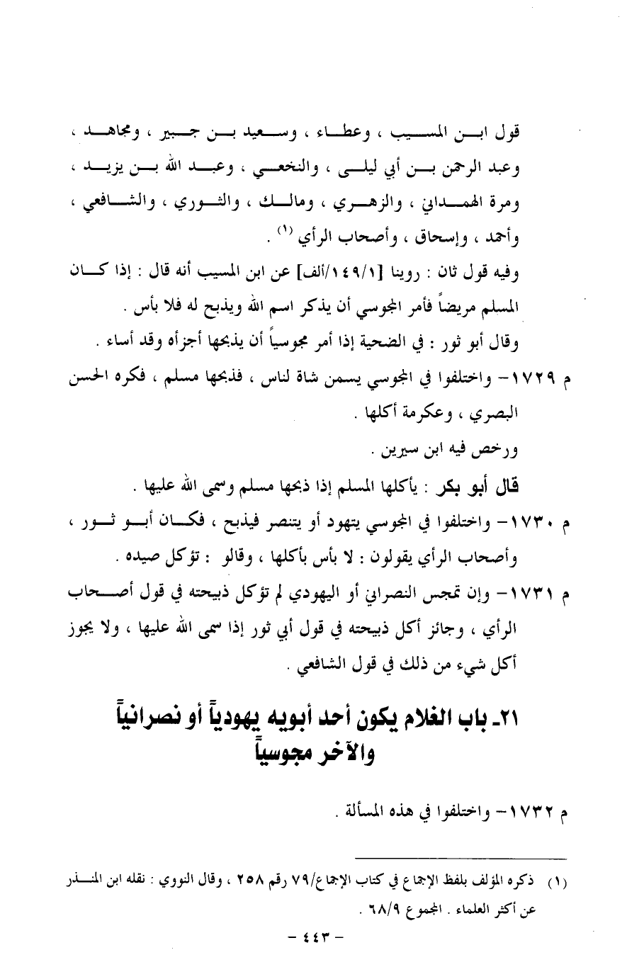 م 1730 - واختلفوا في المجوسي يتهود أو يتنصر فيذبح، فكان أبو ثور، وأصحاب الرأي يقولون: لا بأس بأكلها، وقالو: تؤكل صيده.