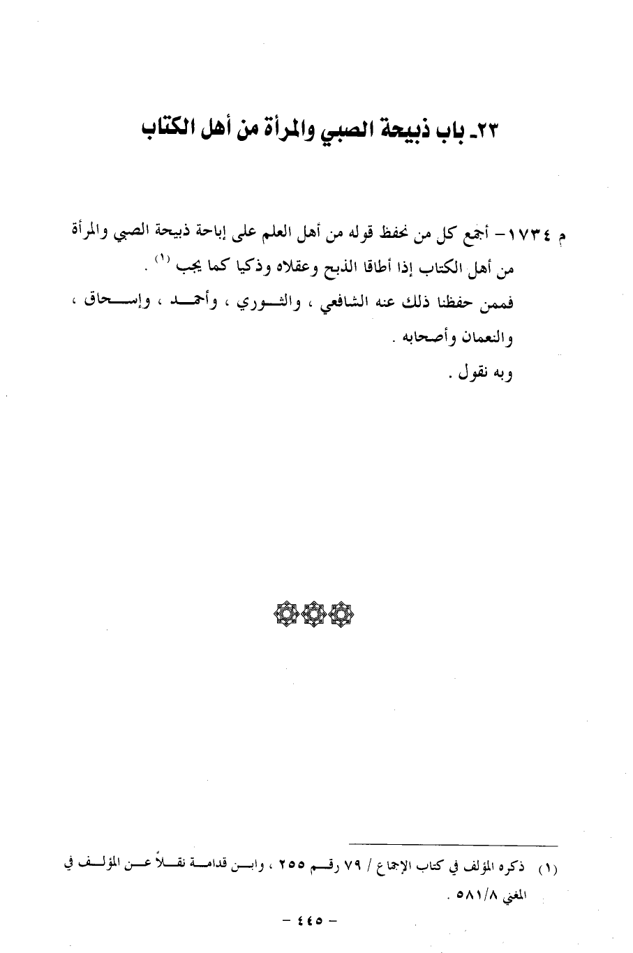 م 1734 - أجمع كل من نحفظ قوله من أهل العلم على إباحة ذبيحة الصبى والمرأة من أهل الكتاب إذا أطاقا الذبح وعقلاه وذكيا كما يجب.