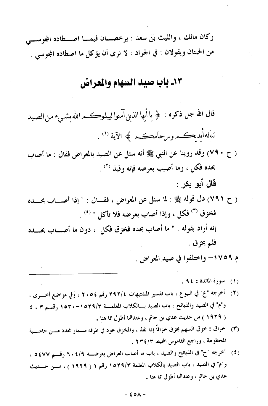 (ح 790) وقد روينا عن النبى - صلى الله عليه وسلم - أنه سئل عن الصيد بالمعراض فقال: ما أصاب بحده فكل، وما أصيب بعرضه فإنه وقيذ.