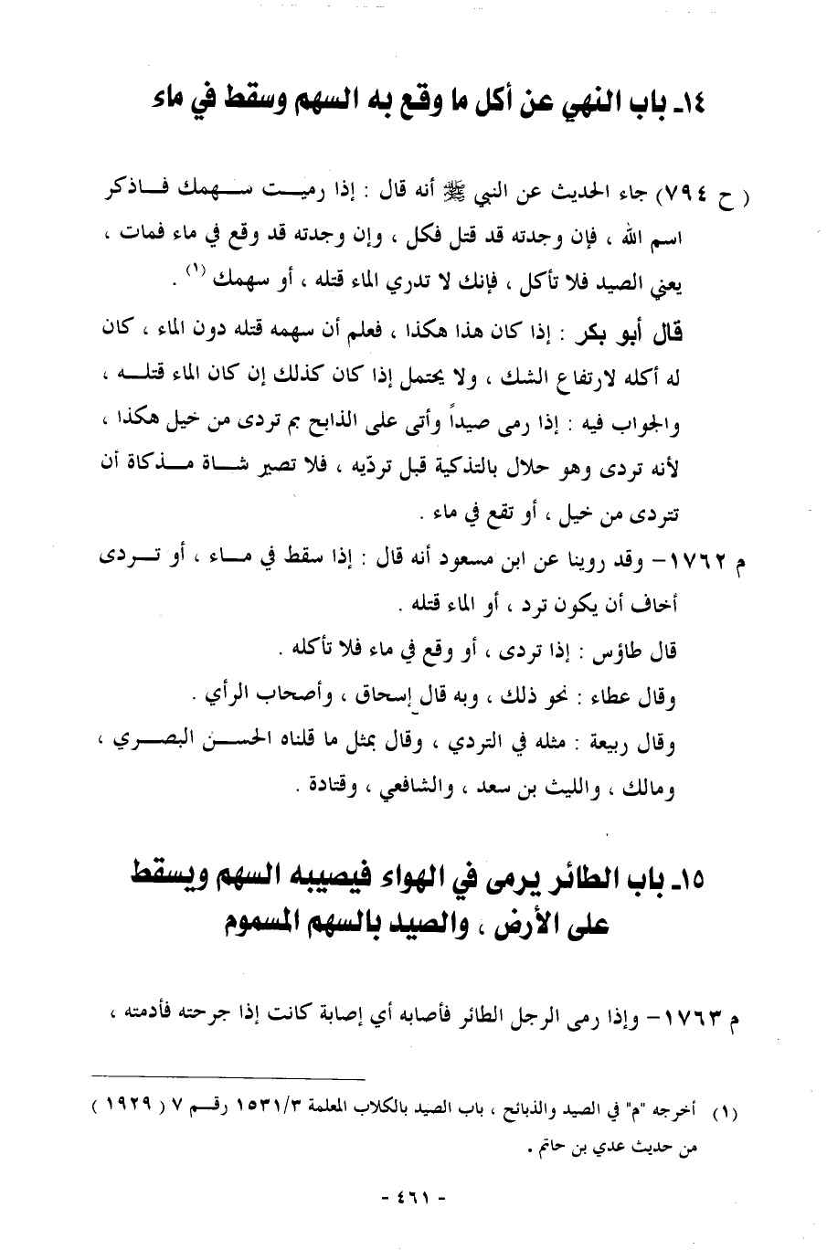 (ح 794) جاء الحديث عن النبي - صلى الله عليه وسلم - أنه قال: إذا رميت سهمك فاذكر اسم الله، فإن وجدته قد قتل فكل، وإن وجدته قد وقع في ماء فمات، يعني الصيد فلا تأكل، فإنك لا تدري الماء قتله، أو سهمك.