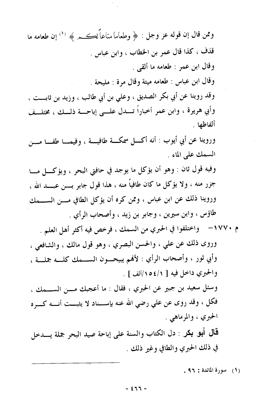 قال أبو بكر: دل الكتاب والسنة على إباحة صيد البحر جميلة يدخل في ذلك الحبري والطافي وغير ذلك.