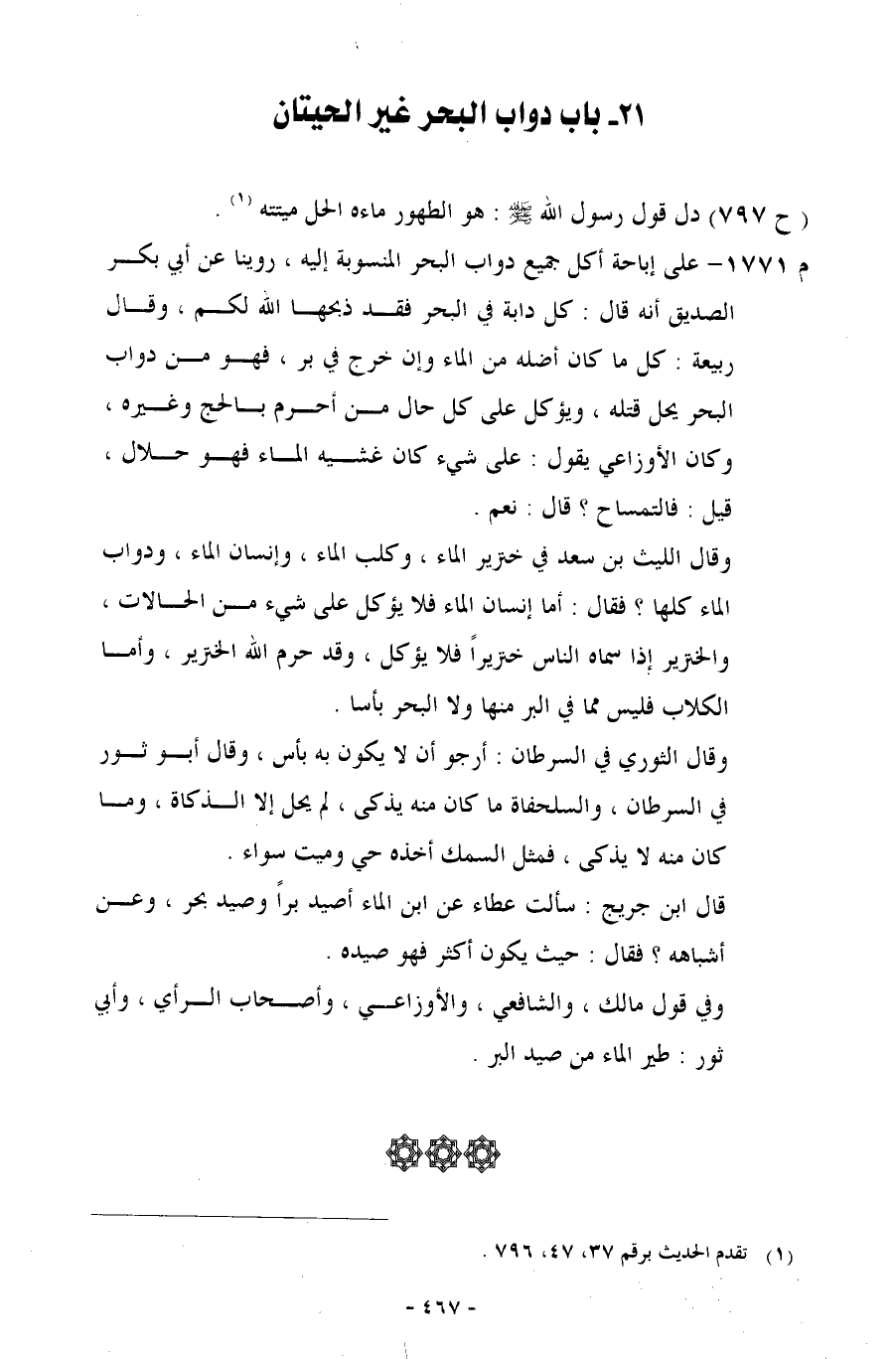 (ح 797) دل قول رسول الله- صلى الله عليه وسلم -: هو الطهور ماءه الحل ميتته.