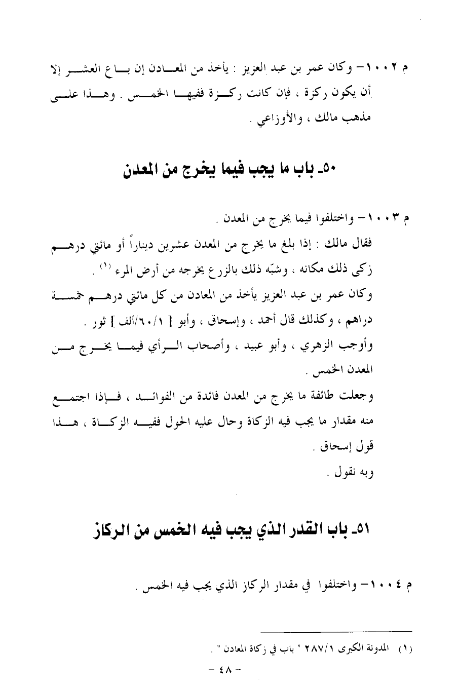 م 1002 - وكان عمر بن عبد العزيز. يأخذ من المعادن إن باع العشر إلا أن يكون ركزة، فإن كانت ركزة ففيها الخمس، وهذا على مذهب مالك، والأوزاعي.