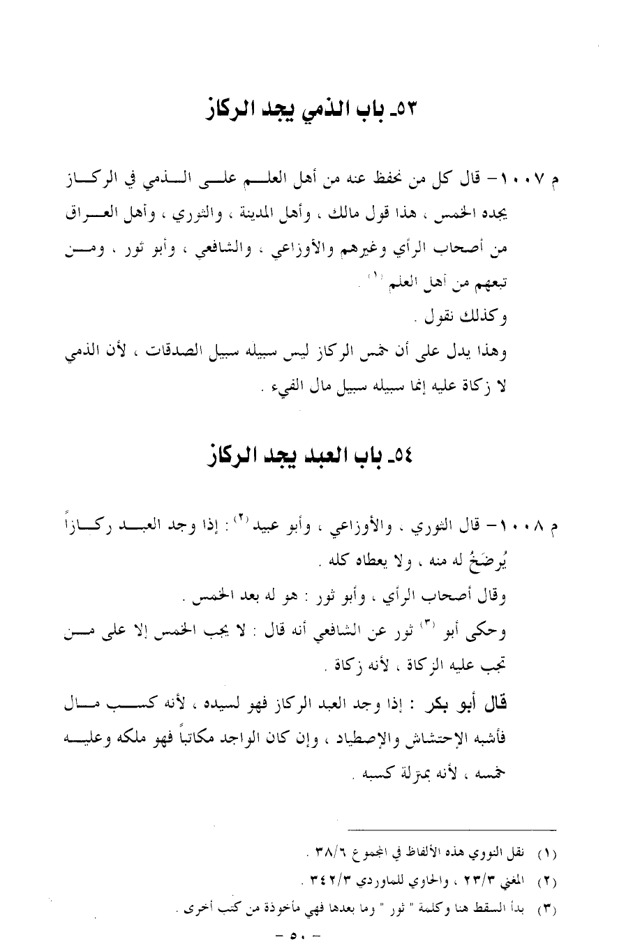 م 1007 - قال كل من نحفظ عنه من أهل العلم على الذمي في الركاز يجده الخمس، هذا قول مالك، وأهل المدينة، والثوري، وأهل العراق من أصحاب الرأي وغيرهم والأوزاعي، والشافعي، وأبو ثور، ومن تبعهم من أهل العلم.
