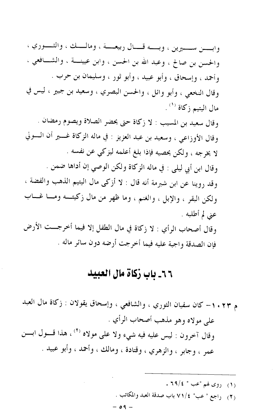 م 1023 - كان سفيان الثوري، والشافعي، وإسحاق يقولان: زكاة مال العبد على مولاه وهو مذهب أصحاب الرأي.