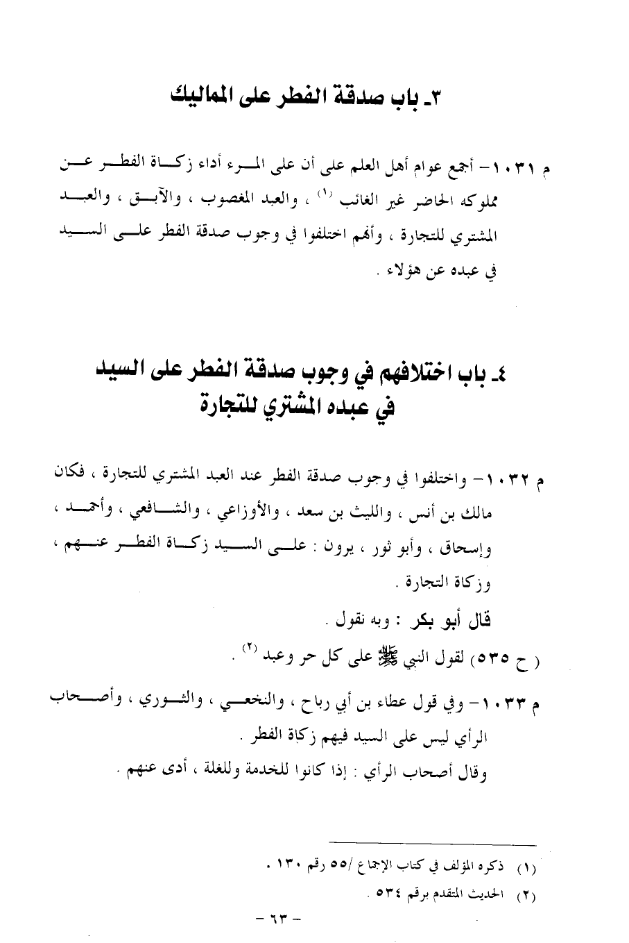 م 1031 - أجمع عوام أهل العلم على أن على المرء أداء زكاة الفطر عن مملوكه الحاضر غير الغائب، والعبد المغصوب، والآبق، والعبد المشتري للتجارة، وأنهم اختلفوا في وجوب صدقة الفطر على السيد في عبده عن هؤلاء.