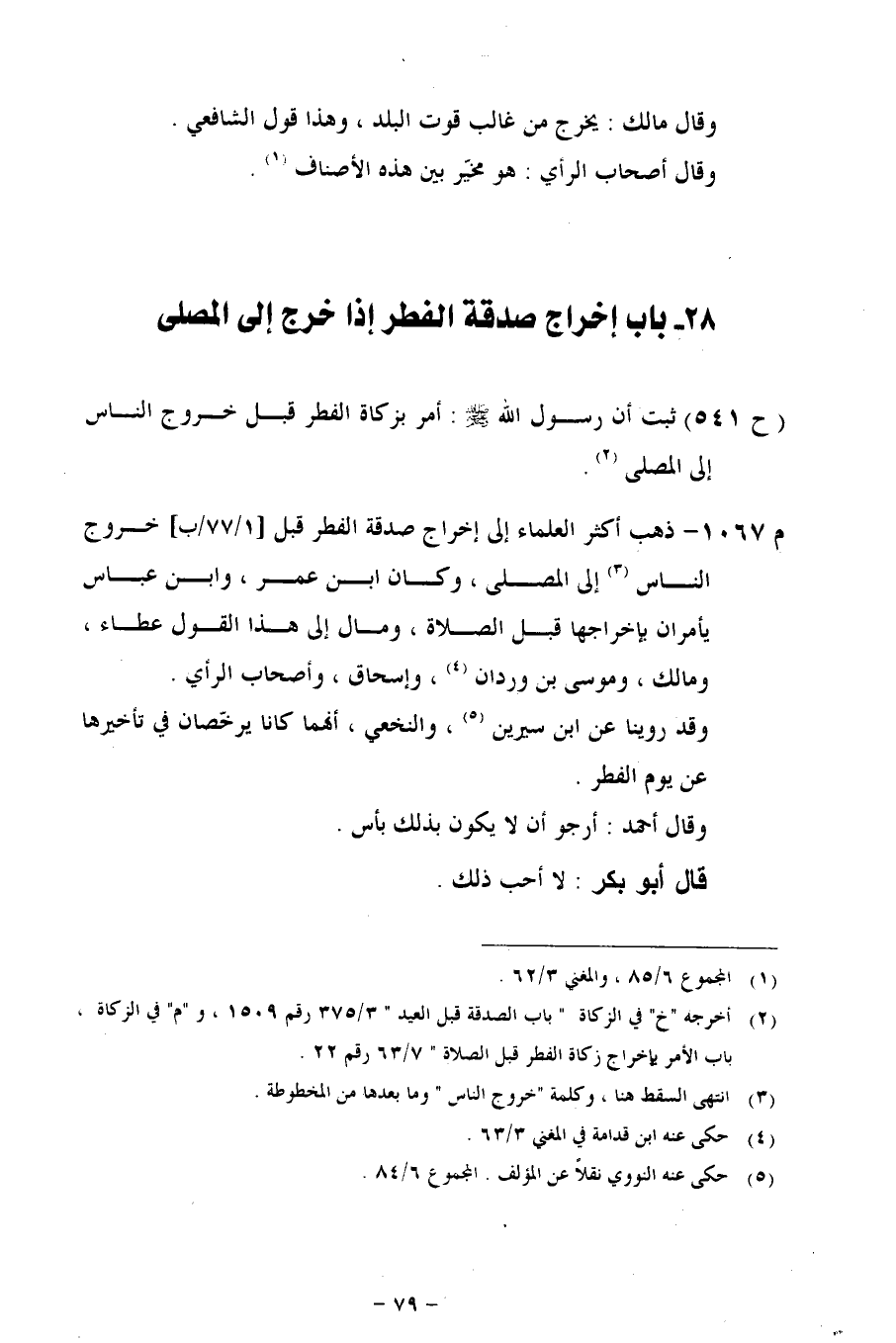 . . . . . . . . . (¬1) [1/ 77/ ب] خروج الناس إلى المصلى، وكان ابن عمر، وابن عباس يأمران بإخراجها قبل الصلاة، ومال إلى هذا القول عطاء، ومالك، وموسى بن وردان، وإسحاق، وأصحاب الرأي.