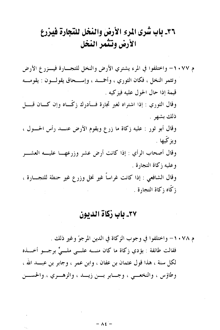 م 1077 - واختلفوا في المرء يشتري الأرض والنخل للتجارة فيزرع الأرض وتثمر النخل، فكان الثوري، وأحمد، وإسحاق يقولون: يقومه قيمة إذا حال الحول عليه فيزكيه.