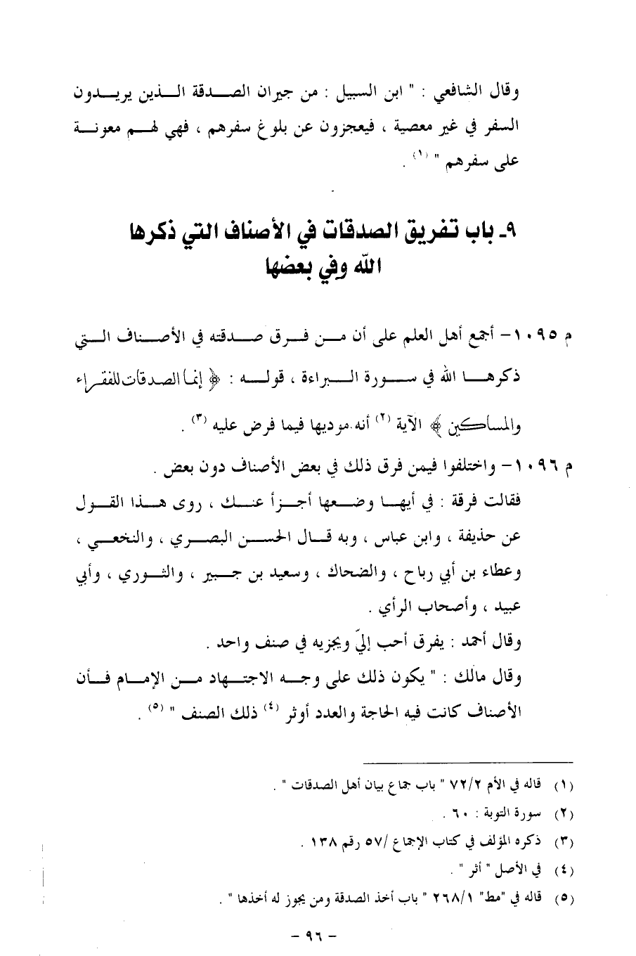 م 1095 - أجمع أهل العلم على أن من فرق صدقه في الأصناف التي ذكرها الله في سورة البراءة، قوله: {إِنَّمَا الصَّدَقَاتُ لِلْفُقَرَاءِ وَالْمَسَاكِينِ} الآية أنه موديها فيما فرض عليه.