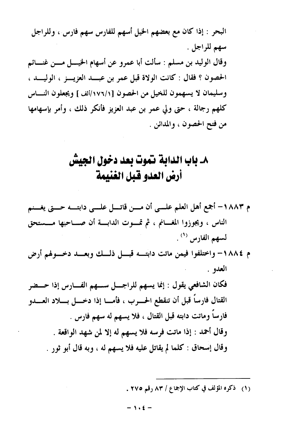 م 1883 - أجمع أهل العلم على أن من قاتل على دابته حتى يغنم الناس، ويجوزا المغانم، ثم تموت الدابة أن صاحبها مستحق لسهم الفارس.
