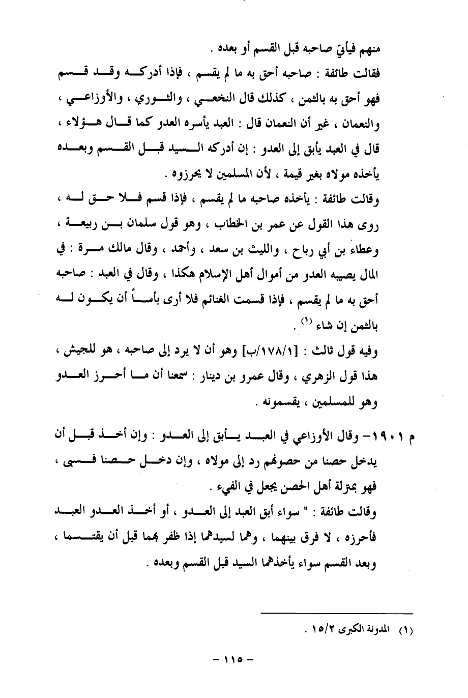 فقالت طائفة: صاحبه أحق به ما لم يقسم، إذا أدركه وقد قسم فهو أحق به بالثمن، كذلك قال النخعي، والثوري، والأوزاعي، والنعمان، غير أن النعمان قال: العبد يأسره العدو كما قال هؤلاء، قال في العبد يأبق إلى العدو: إن أدركه السيد قبل القسم وبعده يأخذه مولاه بغير قيمة؛ لأن المسلمين لا يحرزوه.