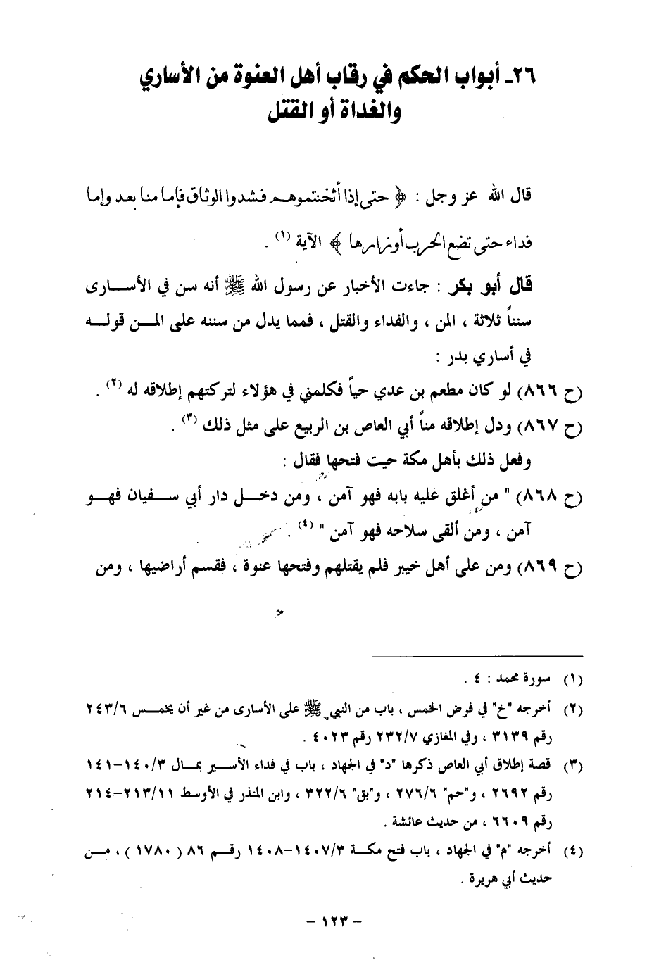 26 - أبواب الحكم في رقاب أهل العنوة من الأساري والغداة أو القتل
