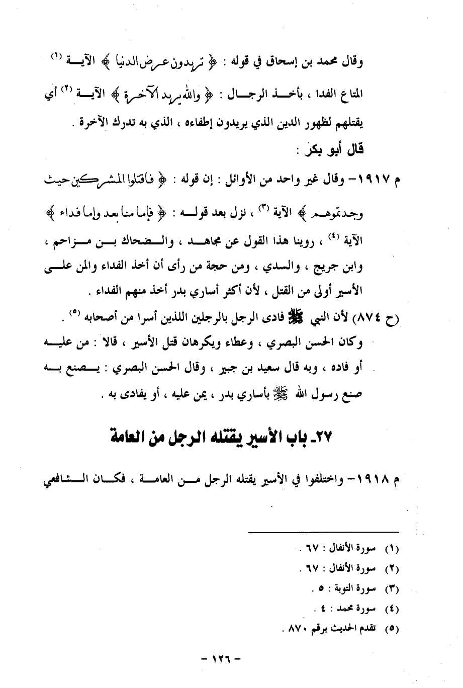 م 1917 - وقال غير واحد من الأوائل: إن قوله: {فَاقْتُلُوا الْمُشْرِكِينَ حَيْثُ وَجَدْتُمُوهُمْ} الآية، نزل بعد قوله: {َإِمَّا مَنًّا بَعْدُ وَإِمَّا فِدَاءً} الآية، روينا هذا القول عن مجاهد، والضحاك بن مزاحم، وابن جريج، والسدي، ومن حجة من رأى أن أخذ الفداء والمن على الأسير أولى من القتل؛ لأن أكثر أساري بدر أخذ منهم الفداء.