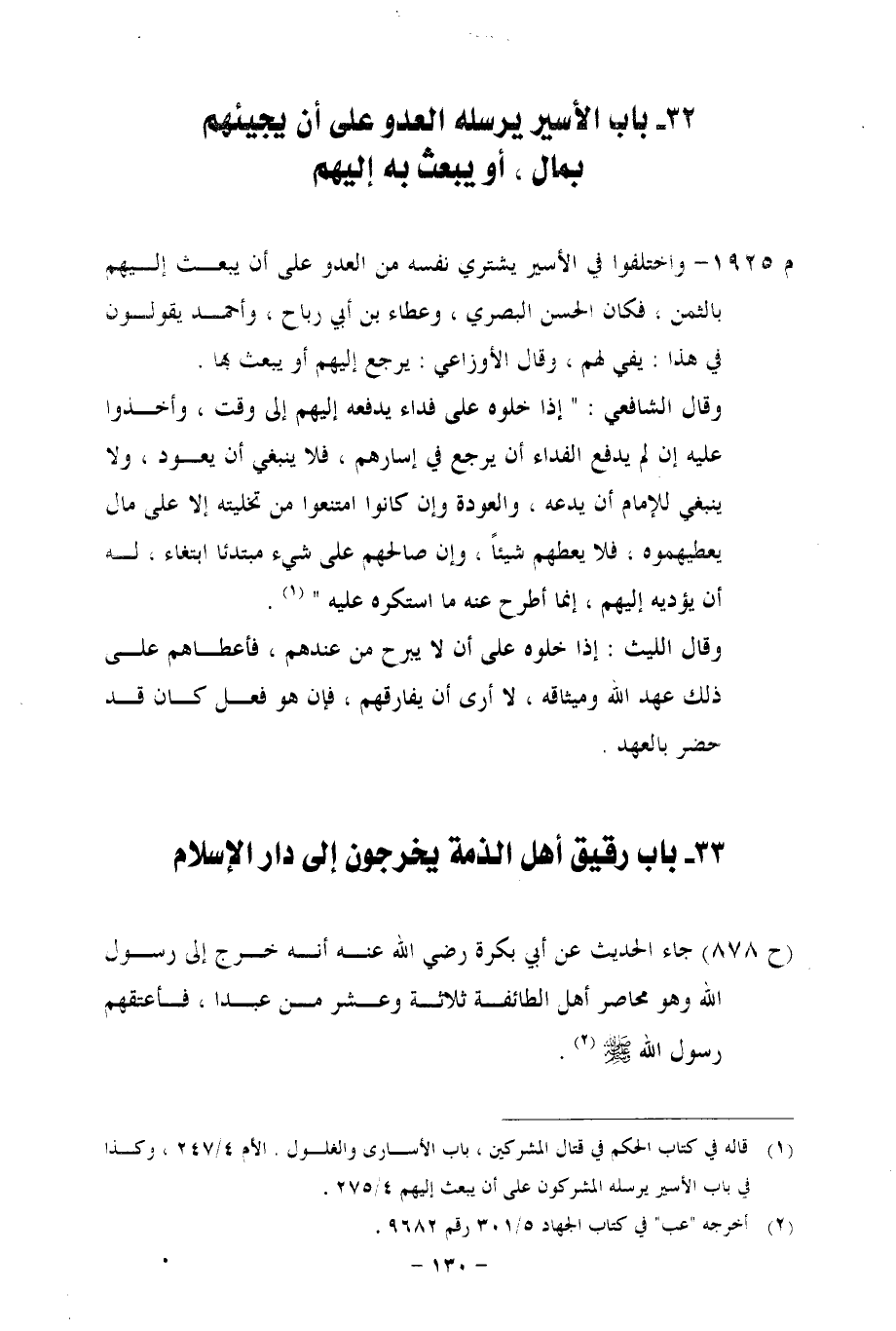 م 1925 - وأختلفوا في الأسير يشتري نفسه من العدو على أن يبعث إليهم بالثمن، فكان الحسن البصري، وعطاء بن أبي رباح، وأحمد يقولون في هذا: يفي لهم، وقال الأوزاعي: يرجع إليهم أو يبعث بها.