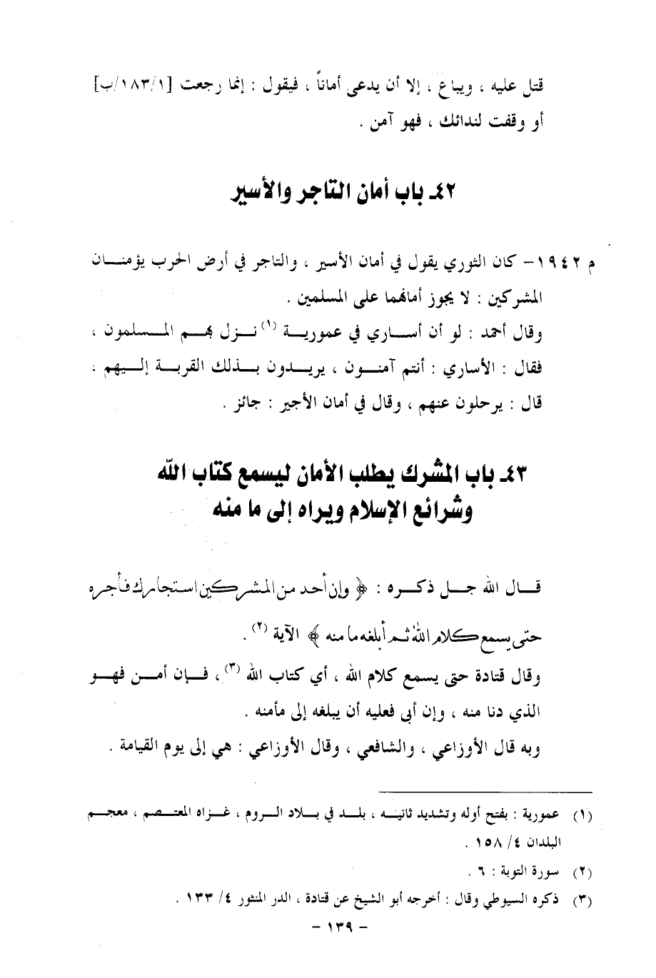 قال الله جل ذكره: {وَإِنْ أَحَدٌ مِنَ الْمُشْرِكِينَ اسْتَجَارَكَ فَأَجِرْهُ حَتَّى يَسْمَعَ كَلَامَ اللَّهِ ثُمَّ أَبْلِغْهُ مَأْمَنَهُ} الآية.
