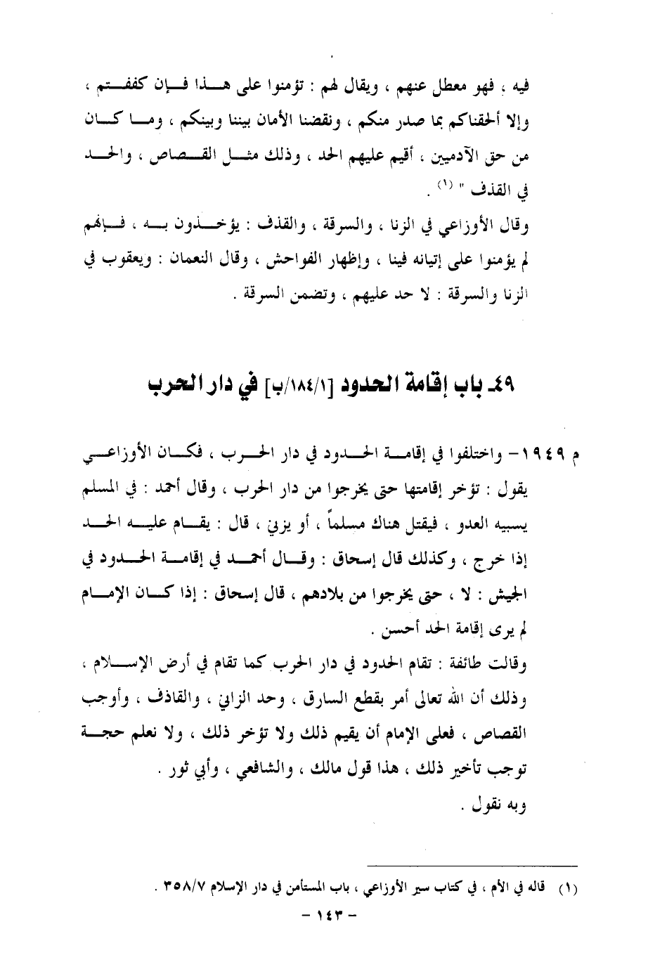 م 1949 - واختلفوا في إقامة الحدود في دار الحرب، فكان الأوزاعي يقول: تؤخر إقامتها حتى يخرجوا من دار الحرب، وقال أحمد: في المسلم يسبيه العدو، فيقتل هناك مسلماً، أو يزني، قال: يقام عليه الحد إذا خرج، وكذلك قال إسحاق: وقال أحمد في إقامة الحدود في الجيش: لا، حتى يخرجوا من بلادهم، قال إسحاق: إذا كان الإمام لم يرى إقامة الحد أحسن.