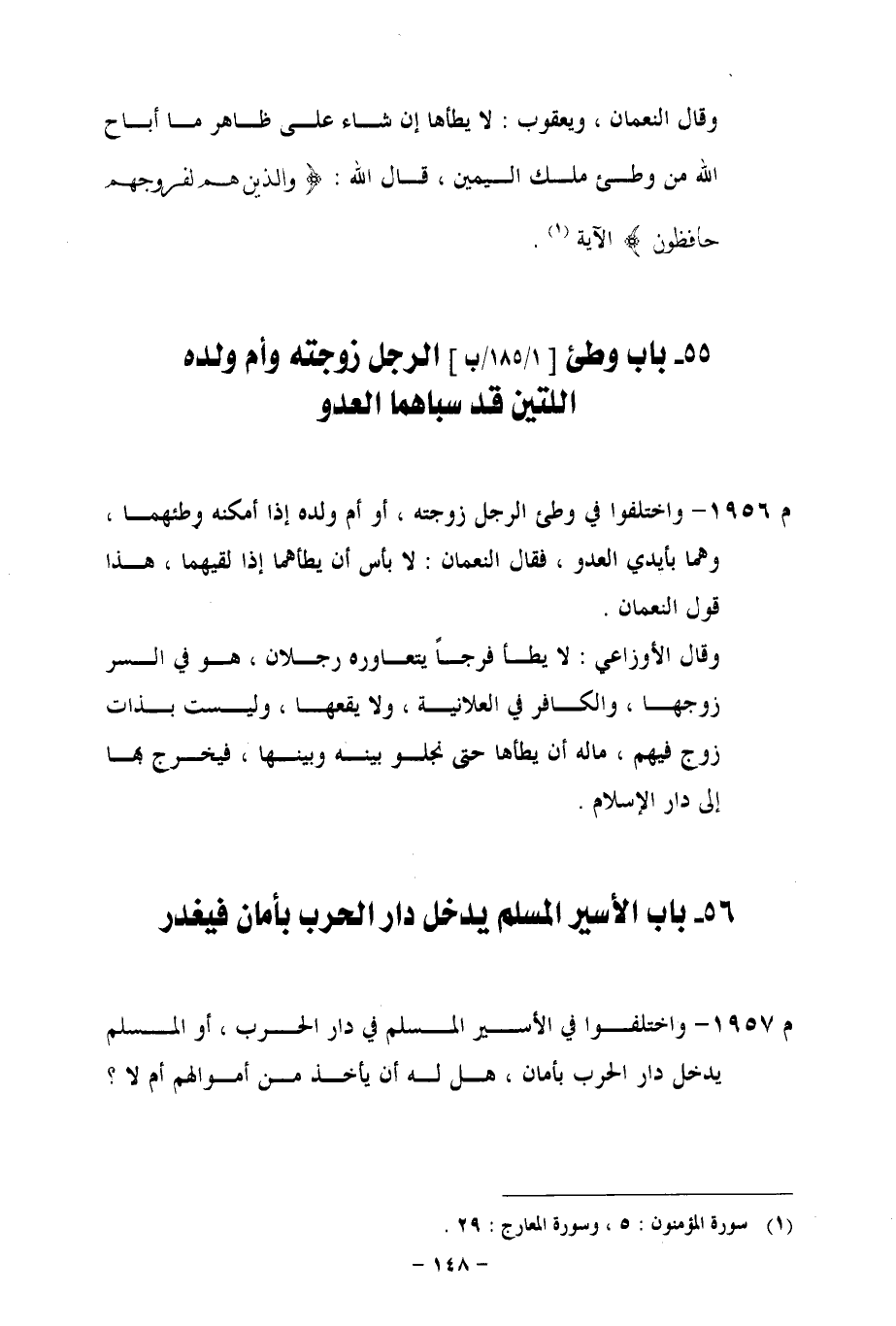 م 1956 - واختلفوا في وطئ الرجل زوجته، أو أم ولده إذا أمكنه وطئهما، وهما بأيدي العدو، فقال النعمان: لا بأس أن يطأهما إذا لقيهما، هذا قول النعمان.