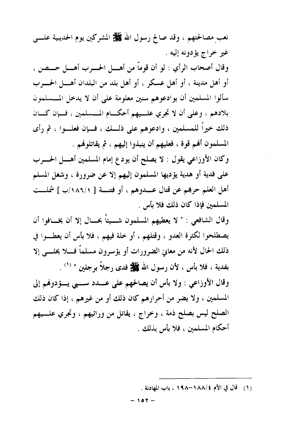 وكان الأوزاعي يقول: لا يصلح أن يودع إمام المسلمين أهل الحرب على فدية أو هدية يؤديها المسلمون إليهم إلا عن ضرورة، وشغل المسلم أهل العلم حربهم عن قتال عدوهم، أو فتنة [1/ 186/ب] شملت المسلمين فإذا كان ذلك فلا بأس.