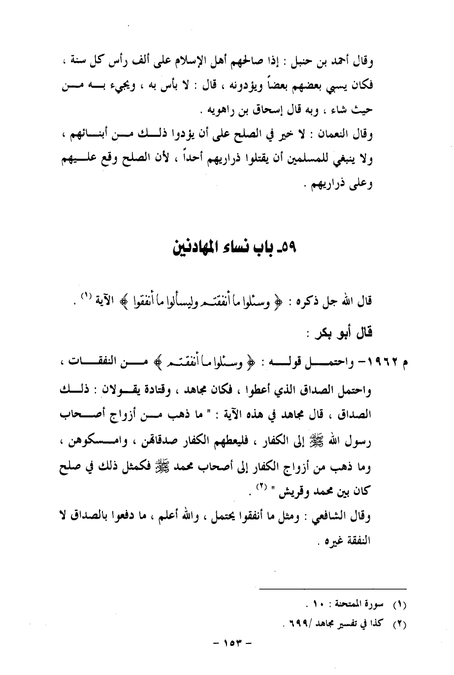 م 1962 - واحتمل قوله: {وَاسْأَلُوا مَا أَنْفَقْتُمْ} من النفقات، واحتمل الصداق الذي أعطوا، فإن مجاهد، وقتادة يقولان: ذلك الصداق، قال مجاهد في هذه الآية: "ما ذهب من أزواج أصحاب رسول الله- صلى الله عليه وسلم - إلى الكفار، فليعطهم الكفار صدقاتهن، وامسكوهن، وما ذهب من أزواج الكفار إلى أصحاب محمد - صلى الله عليه وسلم - فكمثل ذلك في صلح كان بين محمد وقريش".