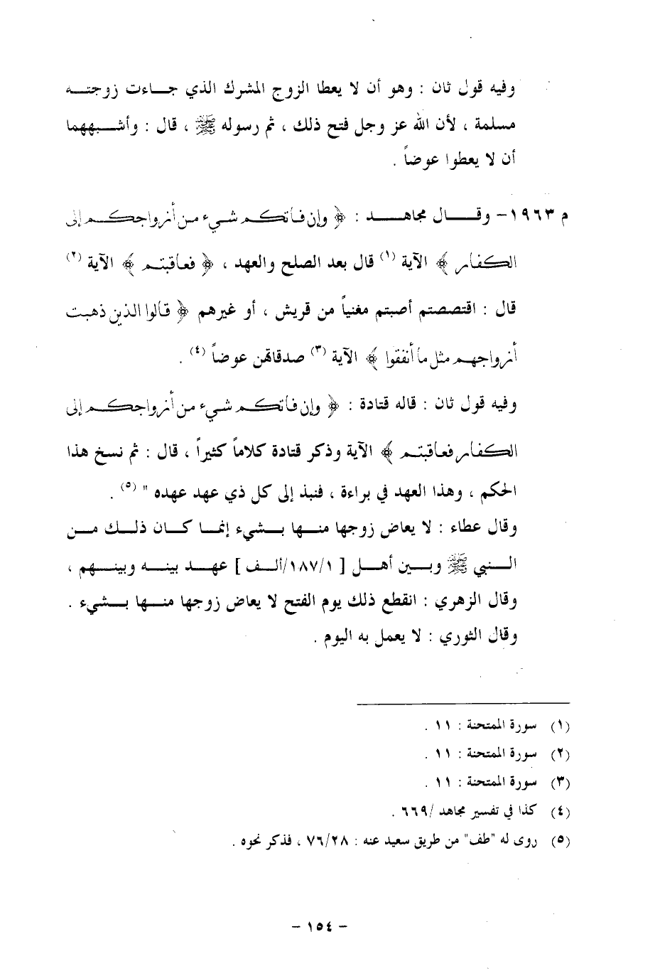 م 1963 - وقال مجاهد: {وَإِنْ فَاتَكُمْ شَيْءٌ مِنْ أَزْوَاجِكُمْ إِلَى الْكُفَّارِ}: الآية قال بعد الصلح والعهد، {فَعَاقَبْتُمْ} الآية قال: اقتصصتم أصبتم مغنياً من قريش، أو غيرهم {فَآتُوا الَّذِينَ ذَهَبَتْ أَزْوَاجُهُمْ مِثْلَ مَا أَنْفَقُوا} الآية صدقاتهن عوضاً.