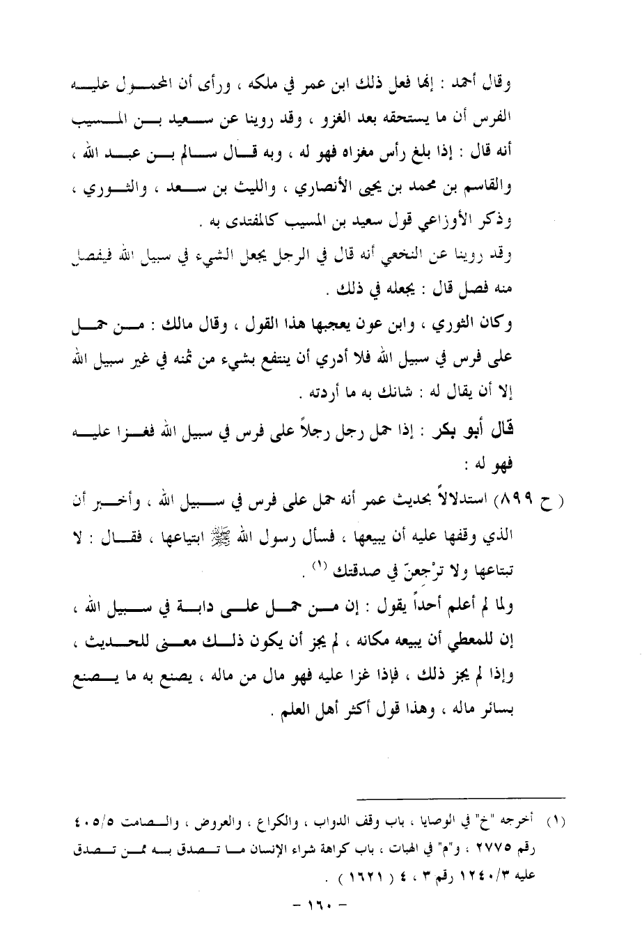 (ح 899) استدلالاً بحديث عمر أنه حمل على فرس في سبيل الله، وأخبر أن الذي وقفها عليه أن يبيعها، فسأل رسول الله - صلى الله عليه وسلم - ابتياعها، فقال: لا تبتاعها ولا ترْجِعنّ في صدقتك.